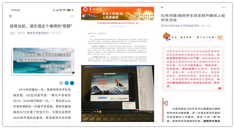 思想教育也是抗击疫情有效的“疫苗”。学生工作部(处)通过官方网站,发布《致全体学生和家长的一封信》,教育引导学生理性认识、科学防范,配合防控、服从大局,合理规划。各学院充分依托微信公众号、班级QQ群等网络平台,持续开展疫情防控宣传和思想引领。石化学院、材料学院辅导员利用新技术手段,在疫情期间分别开展“线上组织生活会”“云班会”,宣传防疫措施,普及防疫知识,凝聚防疫正能量。机械学院辅导员通过个人公众号“娜些年华里的你们”,创作推送了《疫情当前,请珍惜这个难得的“假期”》网文,为学生列出特殊假期使用计划,广受同学们欢迎。