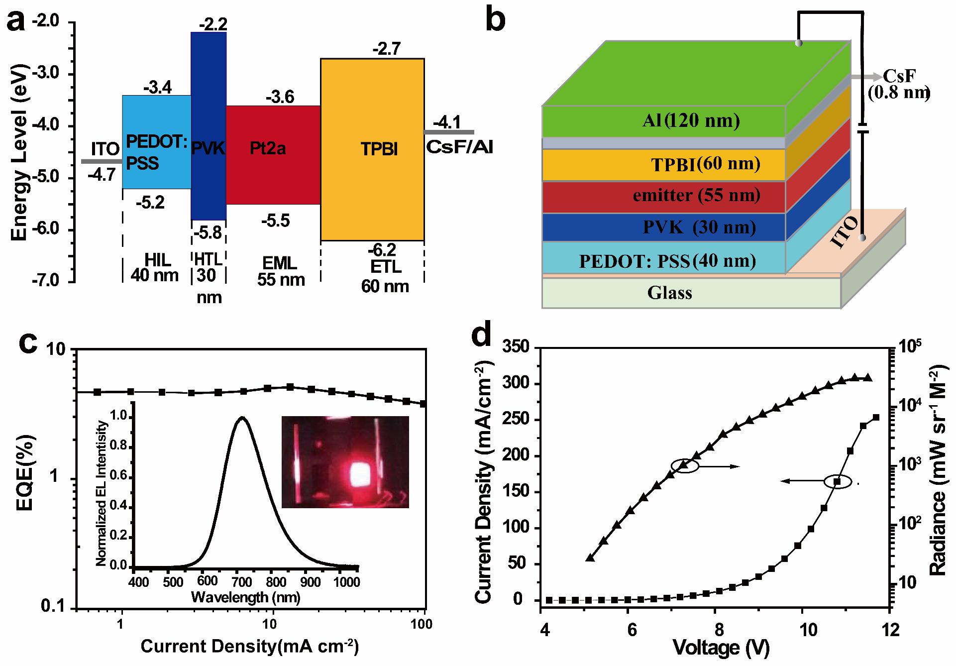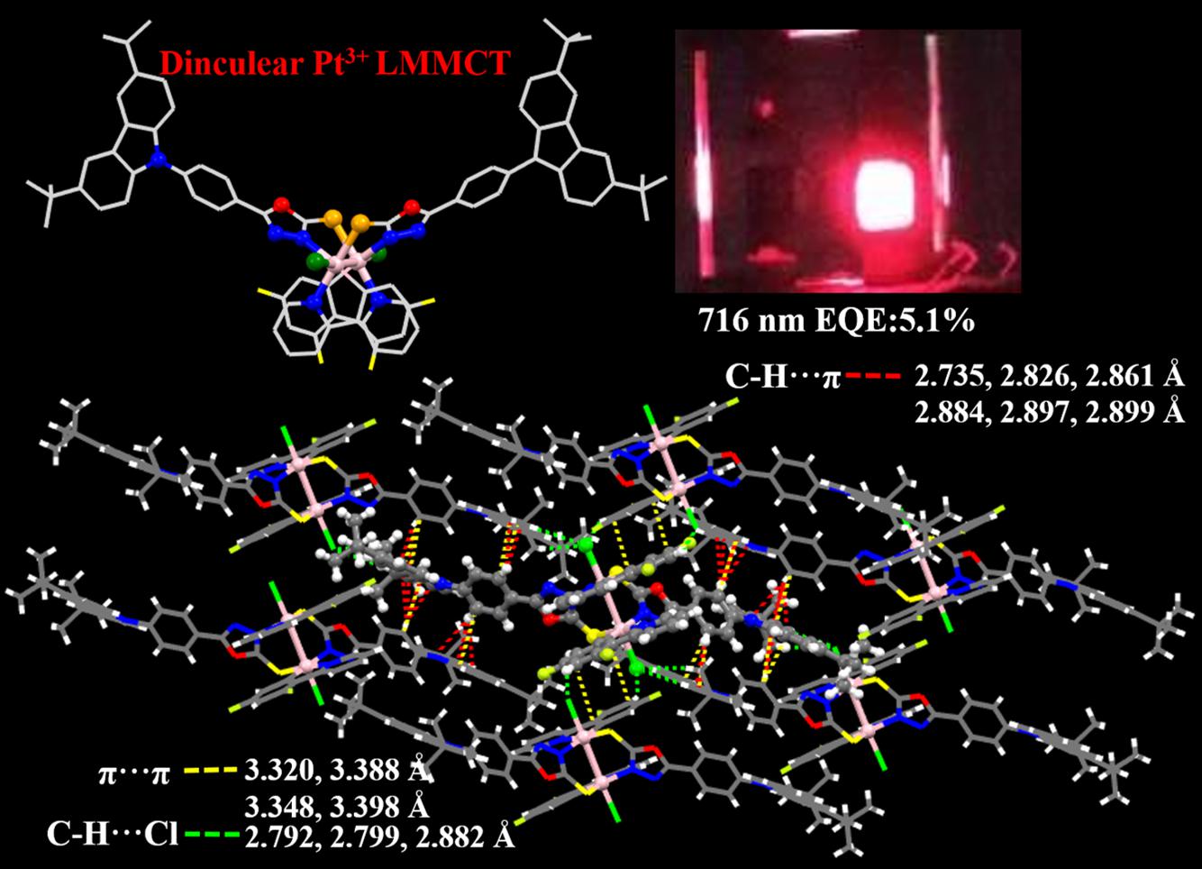 铂配合物(II,IV)是一类重要发光材料,在新材料、新能源、生物医药等战略新兴产业有广阔的应用。然而,具有d7电子排布的三价铂(III)配合物,因电荷转移激发态寿命过短,一般认知是不会放光。实现铂(III)配合物材料发光这一基础前沿科学问题困扰了科研人员多年。