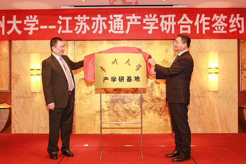 梅立新和陈群为“常州大学-江苏亦通石油科技有限公司产学研基地”揭牌,徐梁、苏旭平代表双方签署了产学研合作协议。(通讯员/魏锦扬 审核/王永利 编辑/庄媛)