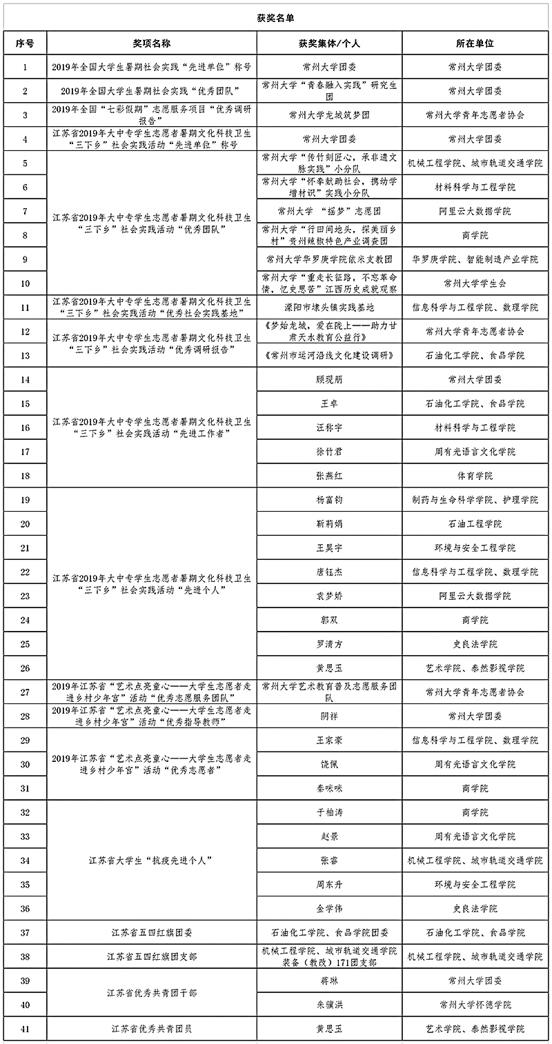 在共青团江苏省委开展的2019年度“江苏省优秀共青团员”“江苏省优秀共青团干部”“江苏省优秀团支部书记”“江苏省五四红旗团委(团支部)评选中,石油化工学院、食品学院团委获评“江苏省五四红旗团委”,机械工程学院、城市轨道交通学院装备(教改)171团支部获评“江苏省五四红旗团支部”,2人获评“江苏省优秀共青团干部”,1人获评“江苏省优秀共青团员”。