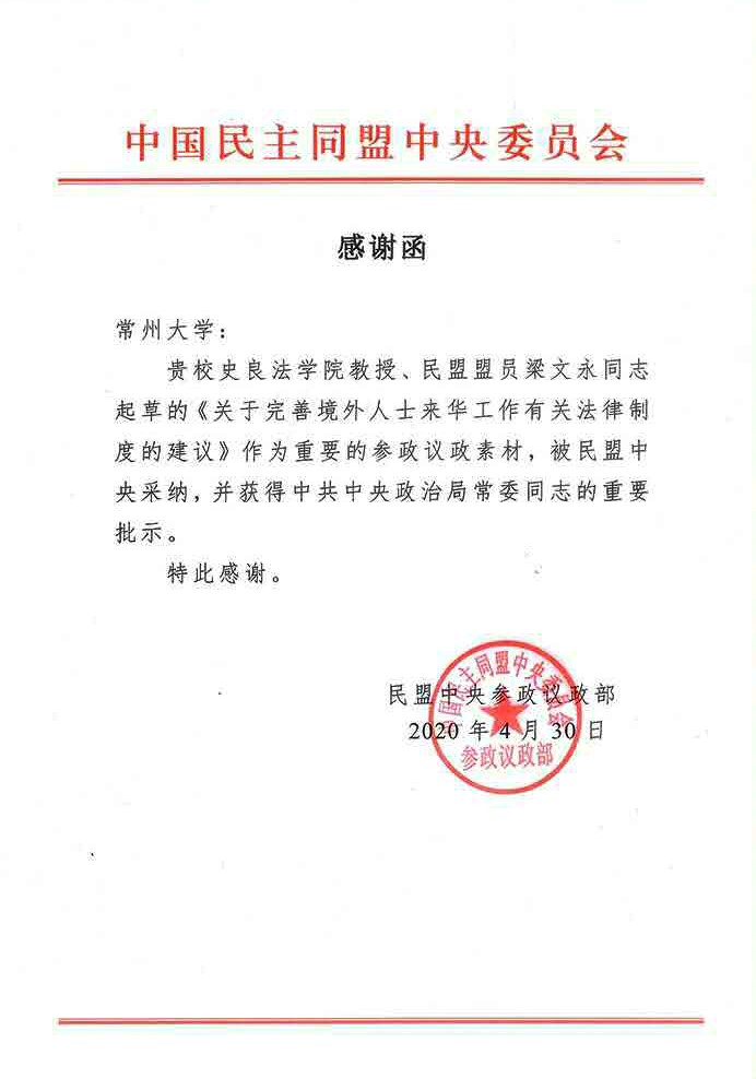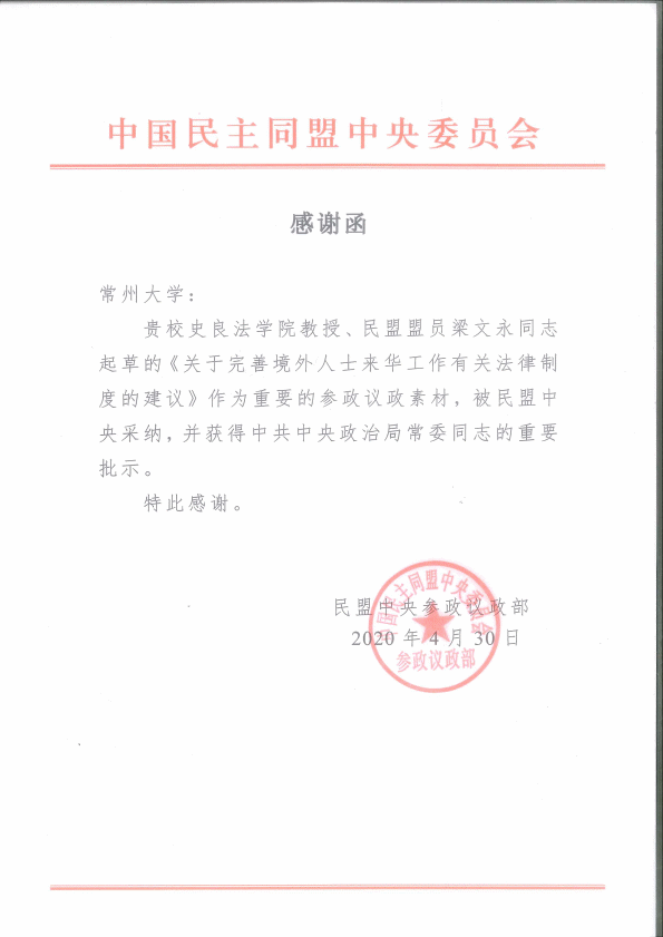 近日,民盟中央向常州大学发出感谢信,感谢我校财税法学者在参政议政领域作出的贡献。我校梁文永教授在抗击新冠肺炎疫情期间起草的《关于完善境外人士来华工作有关法律制度的建议》作为重要的参政议政素材,被民盟中央采纳,并获得中共中央政治局常委领导同志的重要批示。该份建议就进一步完善境外人士来华工作有关财税法律制度提出了意见和建议。