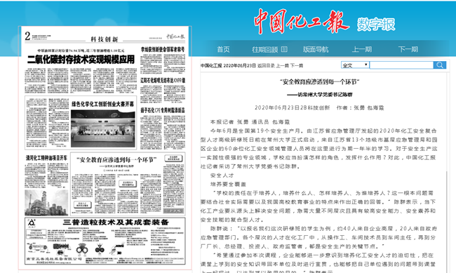 6月23日,中国化工报以“安全教育应渗透到每一个环节”为题,对话我校党委书记陈群。陈群从“安全人才培养要全覆盖”“安全领导力培养要懂专业”“安全教师培养要重实战”等三个方面,介绍了我校安全人才培养的特色做法。具体内容如下:
