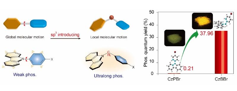 室温磷光(RTP)材料因发光效率高和寿命长等优势,近年来在显示、加密、防伪、传感以及生物成像中的潜在应用备受研究者的青睐。然而,较弱的单线态激发态(Sn)与三线态激发态(Tn)的自旋轨道耦合作用(SOC)常常导致系间窜越(ISC)禁阻,有机分子实现高效率的RTP面临巨大挑战。