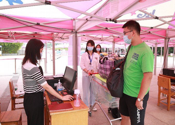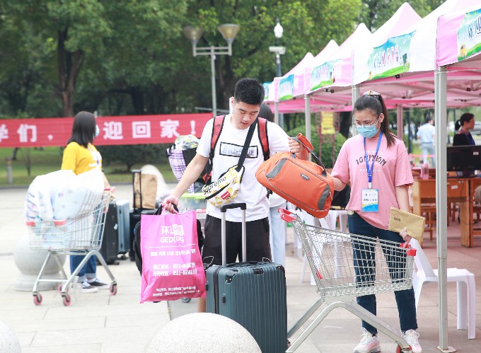 返校报到期间,学校在科教城校区南门、白云校区南门、西太湖校区东门设置多条报到通道,返校学生在安保人员的引导下,间隔1米以上距离,有序排队检测体温,查验“苏康码”,核验身份后进入校园,整个流程井然有序,各环节衔接紧密,高效顺畅。为方便学生安全入校,学校还协调客运公司,开通了机场、汽车站、火车站直达三校区的专线班车迎接学生返校。同时,报到现场专门安排抵达宿舍区的接驳车、行李手推车,组织学生志愿先锋队帮助同学运送行李物品,用贴心的服务和亲切的笑容迎接每一位返校的学子。