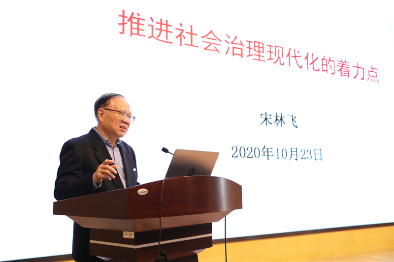 揭牌仪式后,宋林飞作《推进社会治理现代化的四个着力点》专题报告。参与揭牌仪式的各级领导和常州市级机关事务管理部门、各市辖区及溧阳市机关事务管理部门的同志现场聆听报告。报告从十九届四中全会提出的推进国家治理体系和治理能力现代化出发,指出社会治理体系是“党委领导、政府负责、民主协商、社会协同、公众参与、法治保障、科技支撑”。宋林飞结合自己的学术成果、自身参与社会治理的经验和典型社会案例,深入浅出地阐述了推进社会治理现代化的四个着力点:推进市域社会治理现代化;增强社会治理现代化的科技支撑;提高新媒体环境下社会治理能力;及时预警预防社会风险,获得了全体参会人员的一致认可与高度肯定。
