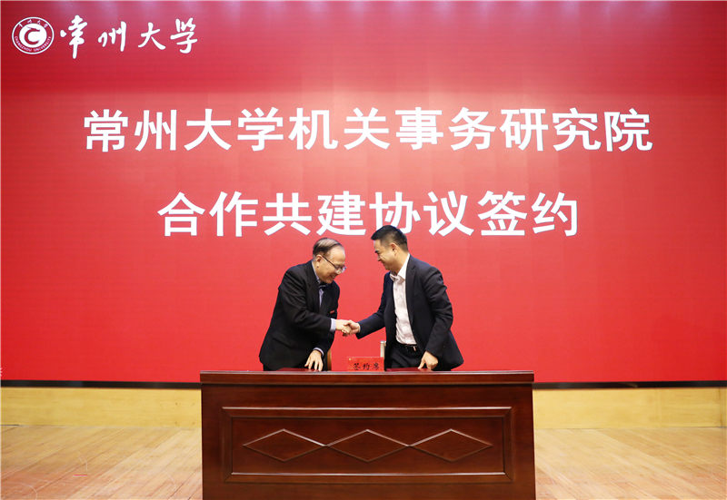 宋林飞与恽淇丞分别代表常州大学与常州市机关事务管理局签署合作共建协议。鲍轶欣和陈群共同为常州大学机关事务研究院揭牌。