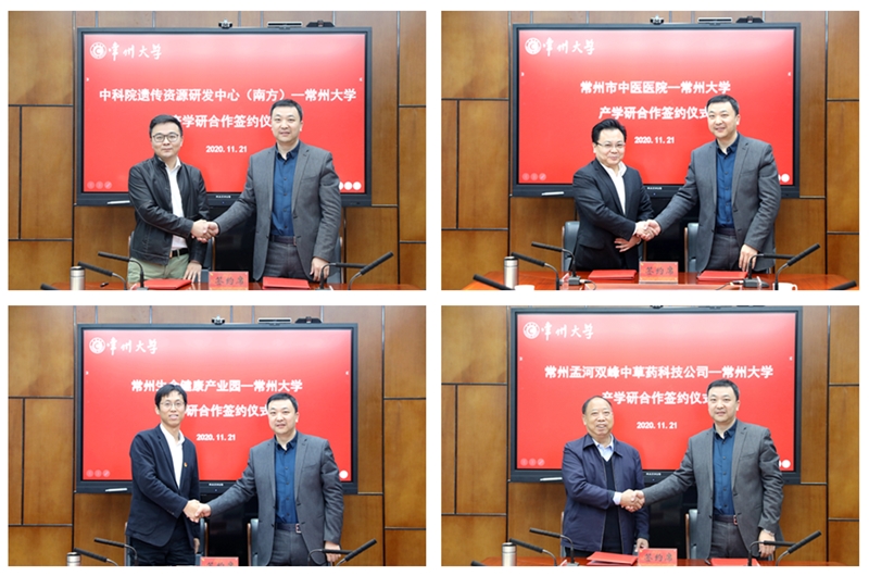 我校分别与中科院遗传资源开发中心(南方)签订了《共建生物医学检测与药物递送联合实验室的协议》,与常州市中医医院签订了《科研与人才培养合作框架协议》,与常州高新区生命健康产业园区签订了《合作共建实验室协议》,与常州市孟河双峰中草药科技有限公司签订了《产学研合作与共建实验室协议》。