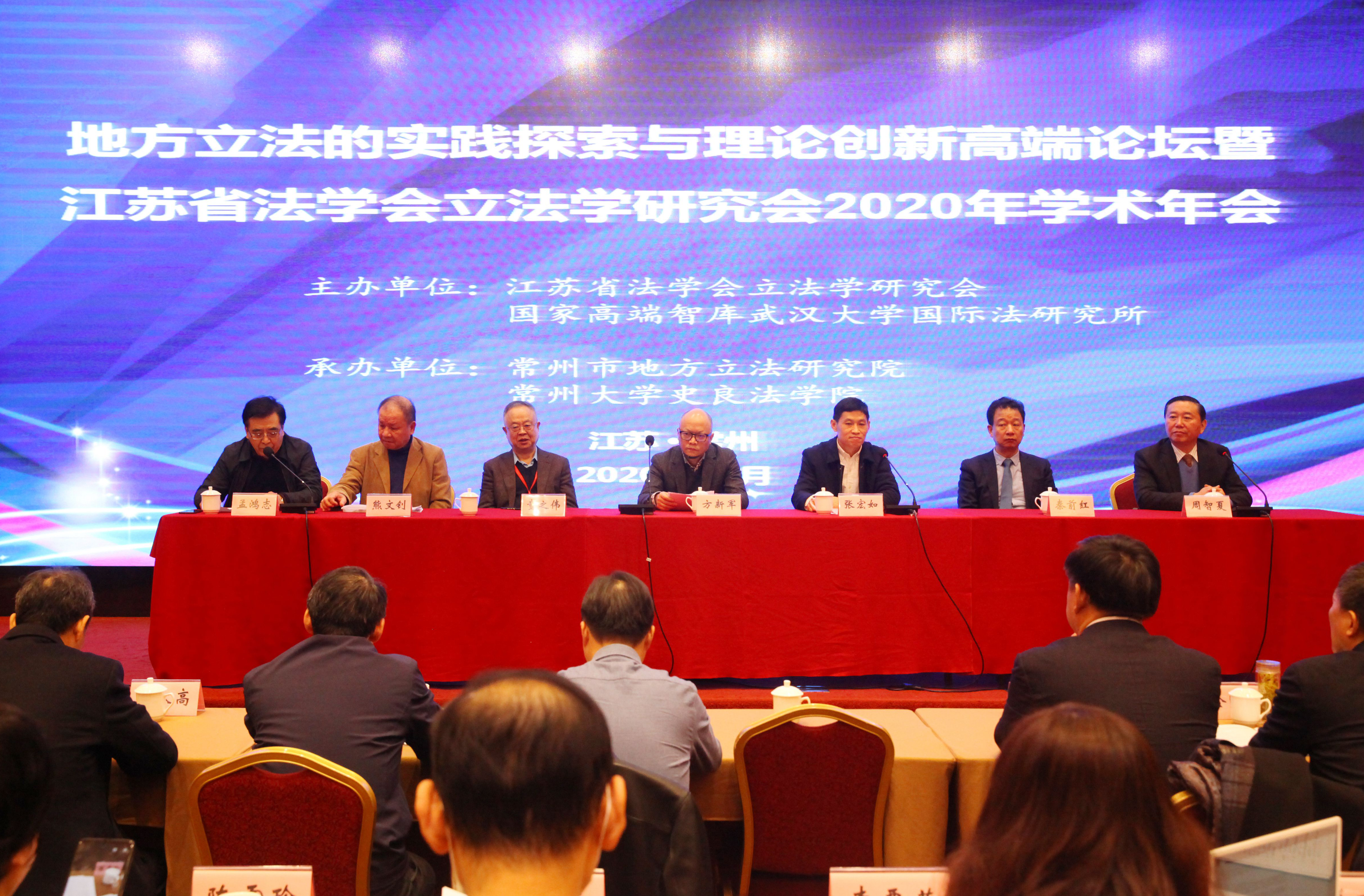 12月12日,由江苏省法学会立法学研究会和国家高端智库武汉大学国际法研究所共同主办,常州市地方立法研究院、常州大学史良法学院承办的地方立法的实践探索与理论创新高端论坛暨江苏省法学会立法学研究会2020年学术年会在常召开。常州大学副校长张宏如,江苏省法学会副会长、苏州大学王健法学院院长方新军,江苏省人大常委会法工委副主任陈志红,常州市人大常委会法工委主任周智夏,湖北省法学会地方立法研究会会长、国家高端智库武汉大学国际法研究所特聘研究员秦前红,中国法学会宪法学研究会副会长、华东政法大学教授童之伟,中国法学会立法学研究会副会长、天津大学特聘教授熊文钊,江苏省法学会立法学研究会会长、东南大学法学院教授孟鸿志等120余位来自各高校及江苏省人大常委会、政府机关、法院、检察院、律师界代表齐聚常州,共话地方立法理论与实践的重要议题。孟鸿志主持会议开幕式。