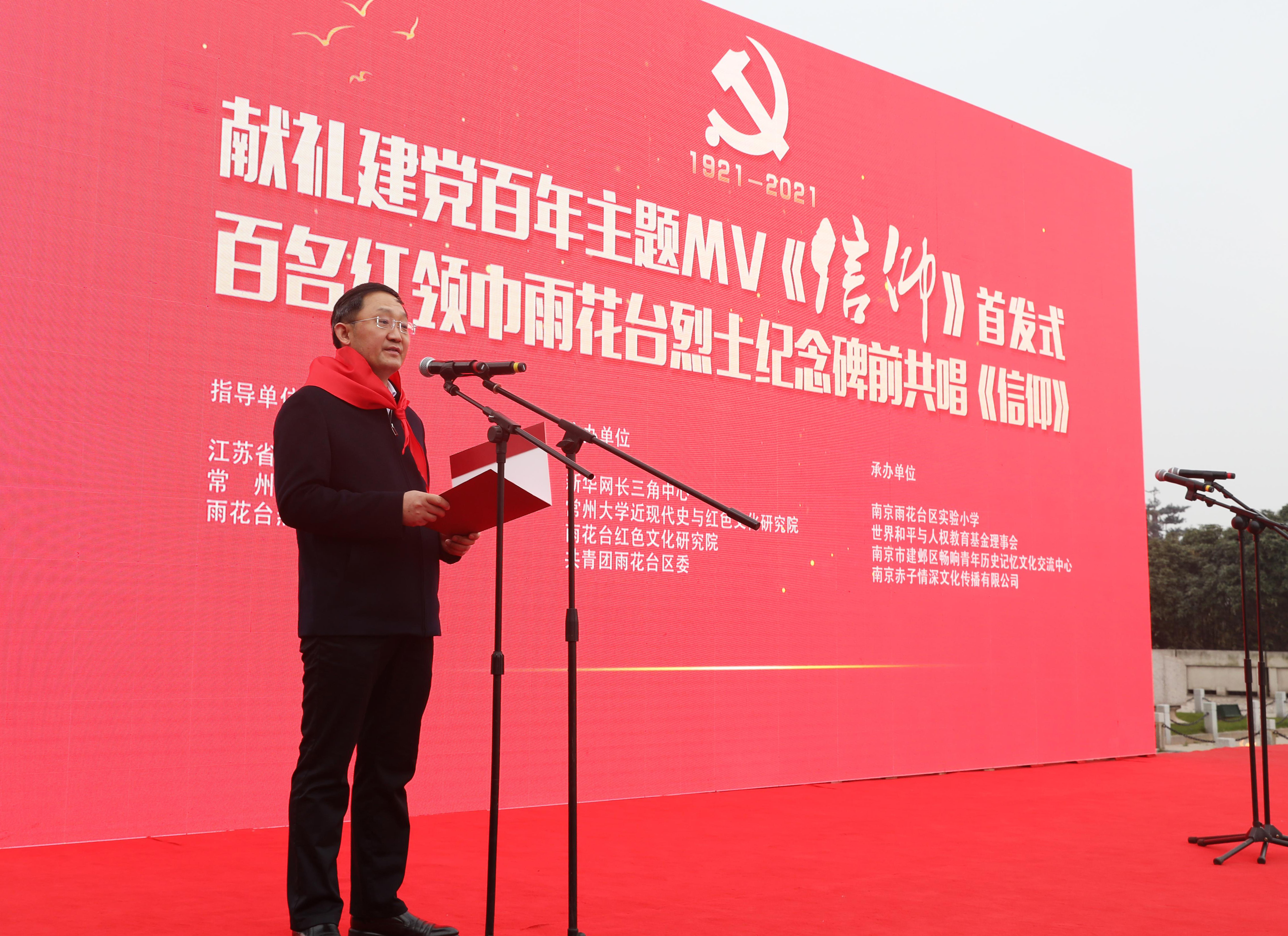 3月15日上午,献礼建党百年主题MV《信仰》在南京雨花台烈士纪念碑前首发,来自南京雨花台区实验小学的100名少先队员登上红色舞台,用稚嫩真切的童音,集体演唱了《信仰》主题歌曲。共青团江苏省委、常州大学、新华网长三角中心、南京雨花台烈士陵园管理局共同主办本次活动。新华网总裁助理、长三角中心主任徐寿权主持仪式。