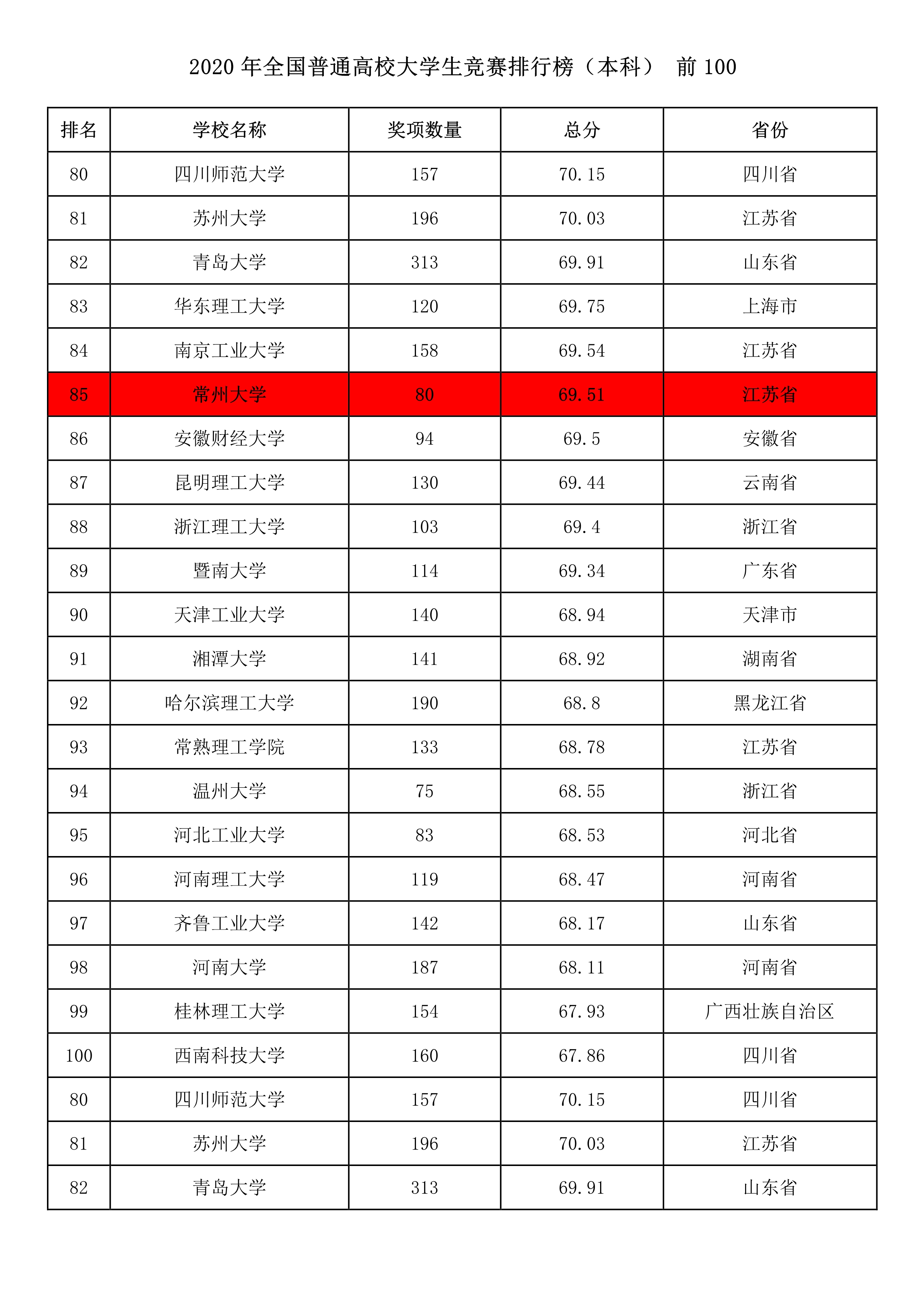 3月22日,中国高等教育学会高校竞赛评估与管理体系研究工作组发布2020全国普通高校大学生竞赛排行榜,我校在相关状态数据排行榜中喜获佳绩。其中,常州大学在2016-2020年全国普通高校大学生竞赛排行榜(本科)前300中位列全国第91名,较上一轮次提升24名,在江苏省高校中位列第10名;在2020年全国普通高校大学生竞赛排行榜(本科)前100中位列全国第85名,较上一年提升5名,在江苏省高校中位列第11名;在2016-2020年全国地方本科院校大学生竞赛排行榜前100中位列全国第44名,较上一轮次提升14名,在江苏省高校中位列第4名;在全国普通高校大学生竞赛排行榜五轮总排行榜(本科) 前300中位列全国第129名,江苏省高校第15名。