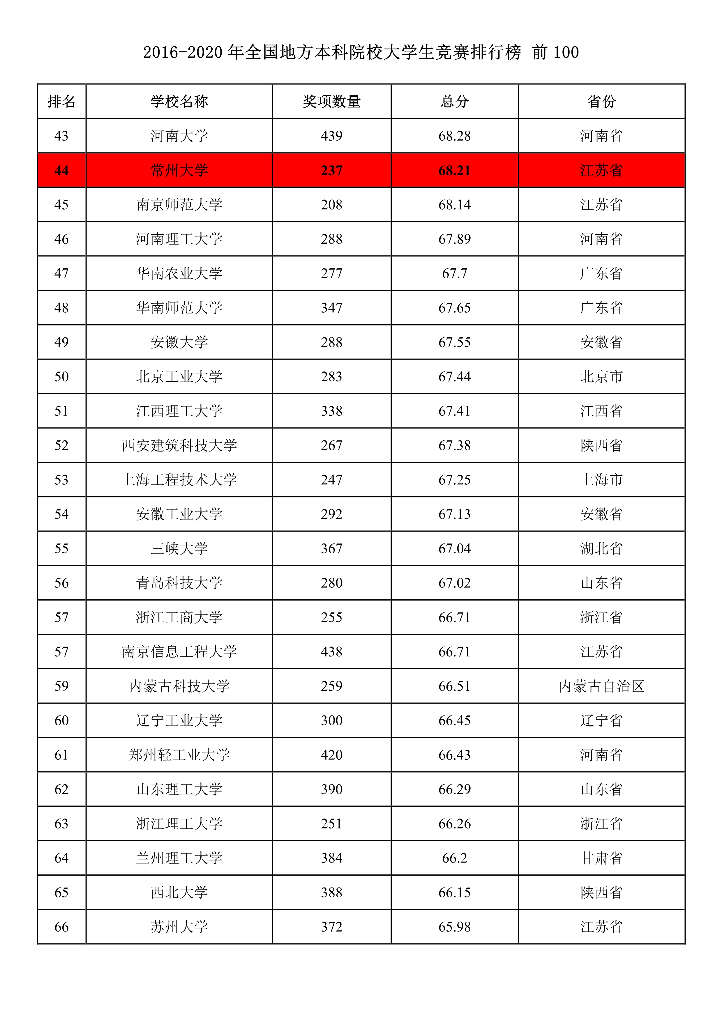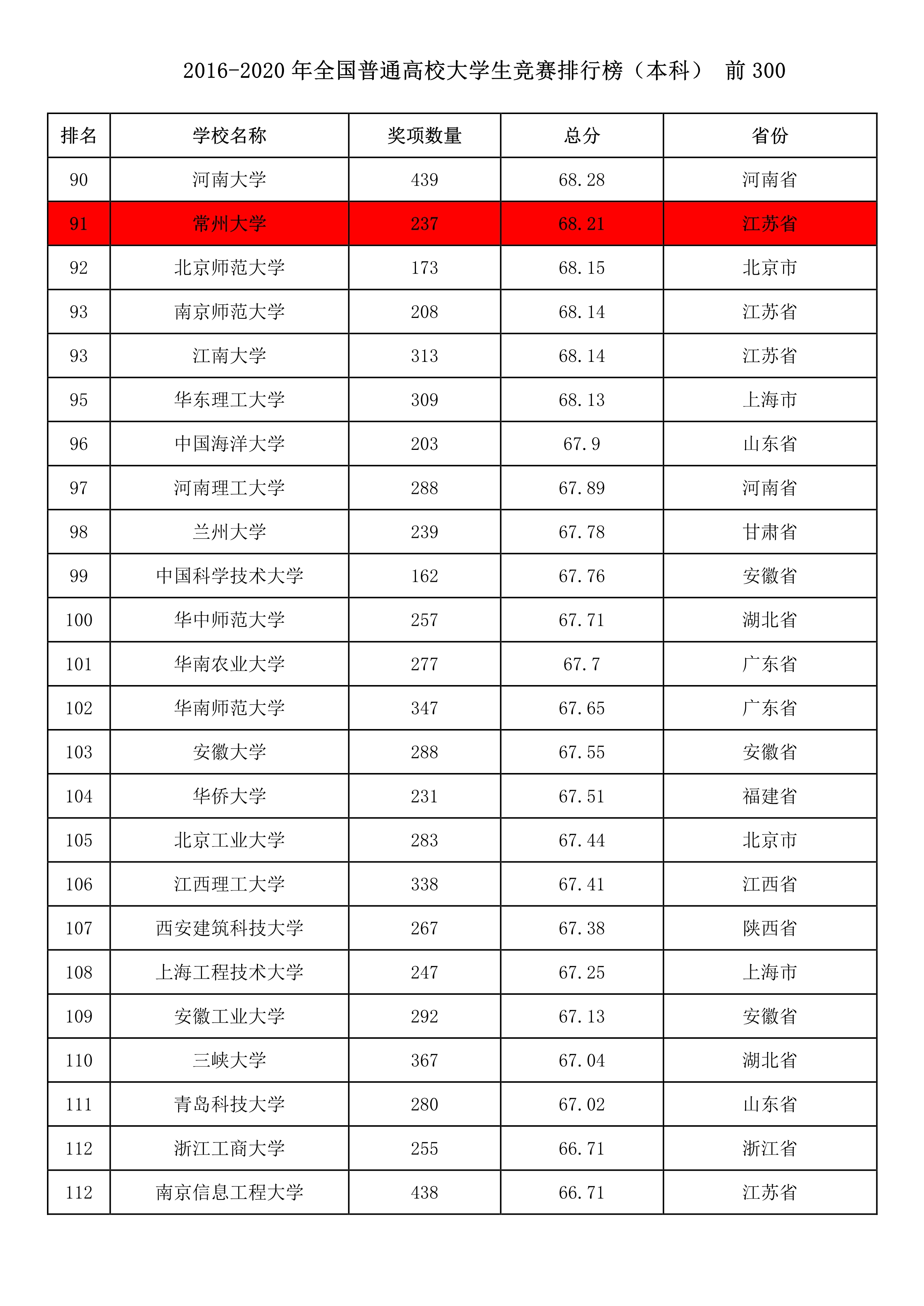 自2017年12月14日中国高等教育学会《高校竞赛评估与管理体系研究》专家工作组在杭州首次发布2012-2016年我国普通高校大学生竞赛评估结果以来,已连续4年发布榜单,在社会上引起广泛关注,此次为第5次发布。2016-2020年榜单(本科)共列入全国1199所本科院校,从各省份高校进入前300的情况来看,进入高校数量前3的为:江苏省(30所)、山东省(24所)和浙江省(24所),前100榜单中,江苏省最高(12所),安徽省和山东省次之(9所),广东省、浙江省和重庆市并列第三(各7所),常州大学首次进入该榜单TOP100。
