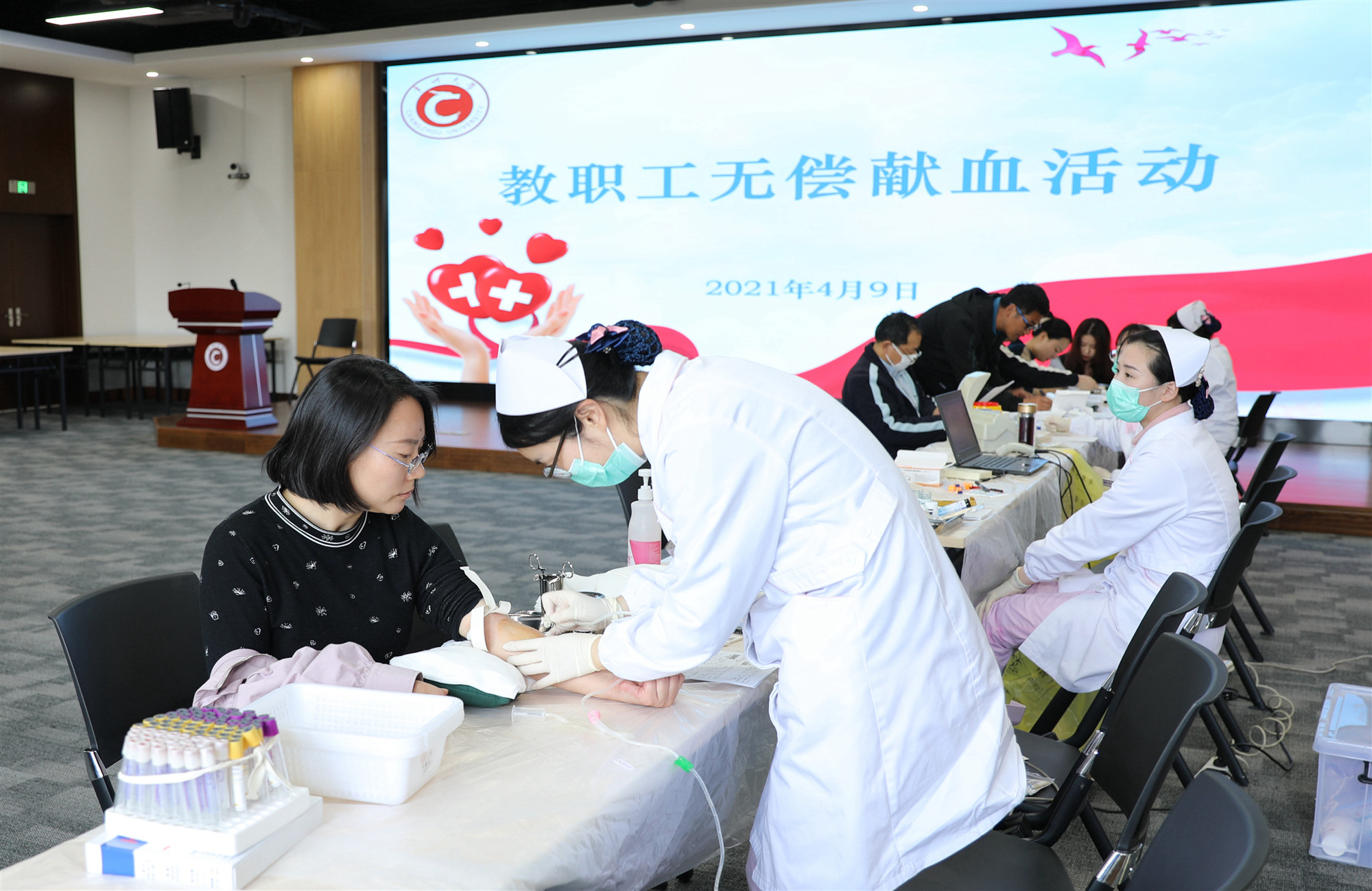 接《常州市政府办公室关于做好2021年度全市无偿献血工作的通知》后,学校快速反应,积极动员,4月9日下午,学校在科教城校区和西太湖校区同时组织教职工参加义务献血。副校长张宏如看望慰问献血教职工。