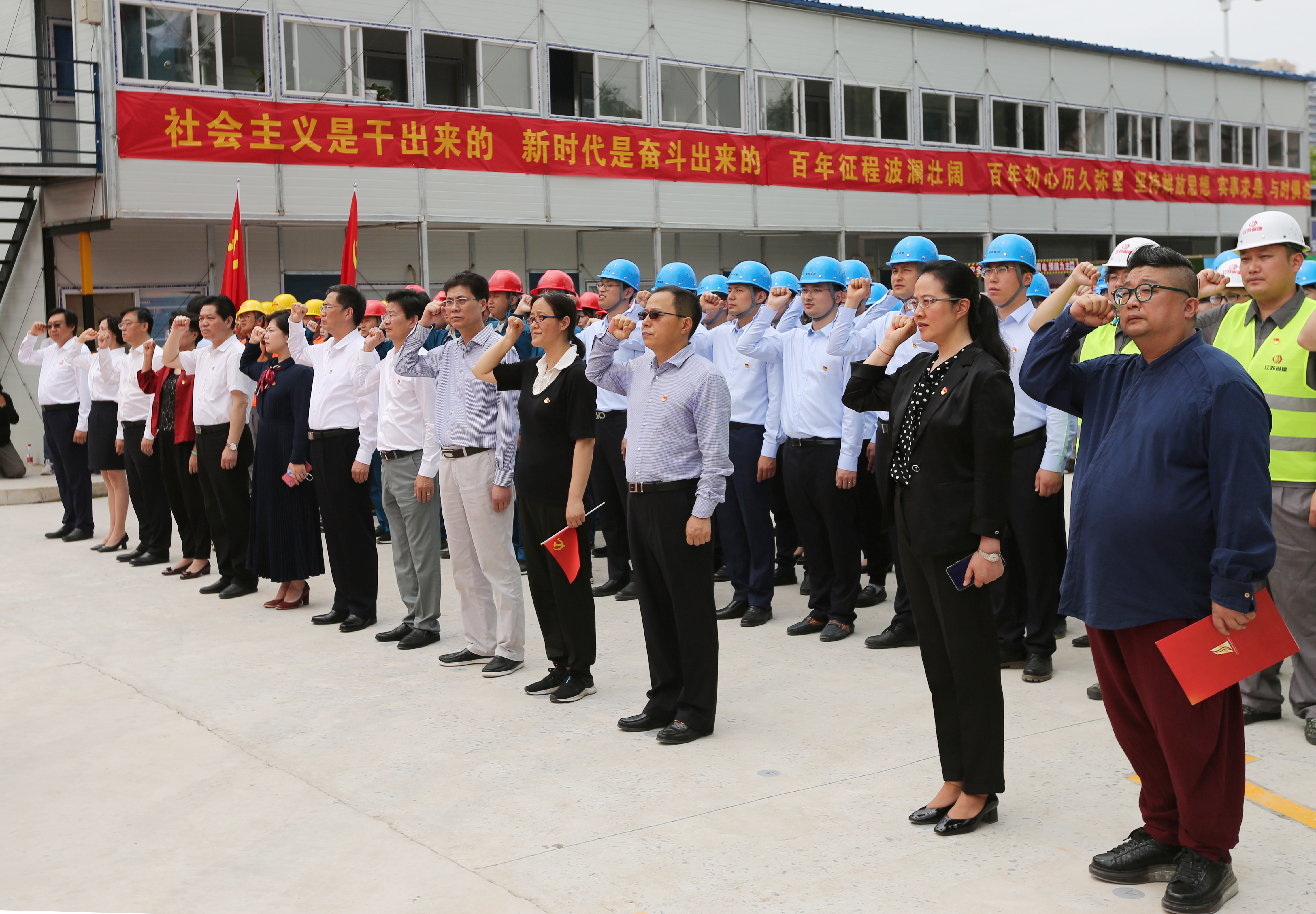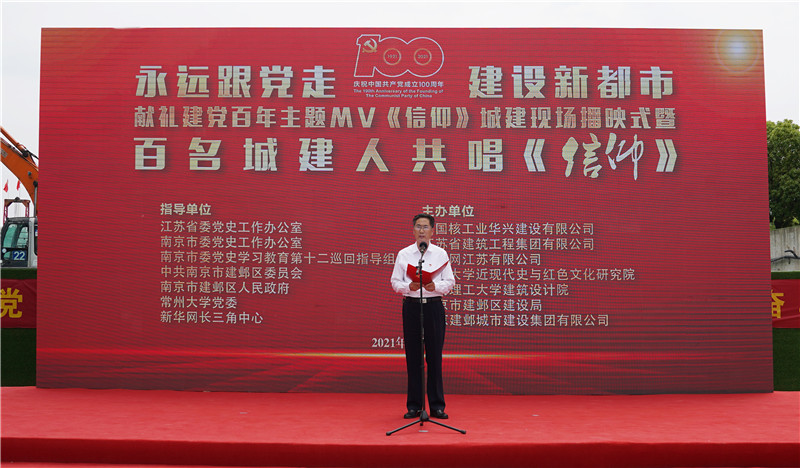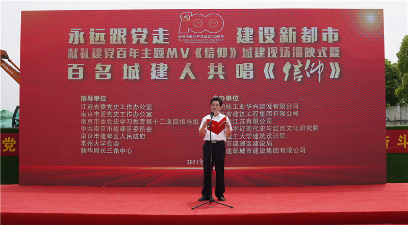 5月25日上午,来自南京建邺城建集团有限公司、江苏省建筑工程集团有限公司和中国核工业华兴建设有限公司的设计、施工、监理、建管等方面的100名城建人,齐聚在河西江东北路南京市重大项目AMC博物馆群工地现场,在打桩机和挖掘机的轰鸣伴奏下,在一面面鲜艳的党旗迎风飘扬中,高声共唱《信仰》之歌,表达广大城建人“永远跟党走 建设新都市”的决心,展示他们始终坚持“为人民服务”和践行“三个敬畏”的初心,营造了浓厚的党史学习教育氛围,以心中有信仰和肩上有担当的实际行动,传承与赓续红色基因,庆祝中国共产党成立100周年。常州大学党委副书记、副校长戴国洪,南京市建邺区委副书记梁爱国,江苏省委党史工作办公室二级巡视员赵民强,新华网长三角中心执行主任彭亚平,建邺区委常委、宣传部长周峰,南京建邺城建集团董事长兼总经理黄峰,建邺区国资办主任於金勇,常州大学党委常委、宣传部部长杨琳,马克思主义学院相关负责人及教师代表出席活动。