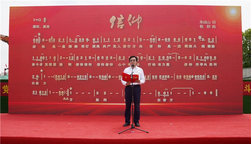 《信仰》歌曲是由常州大学马克思主义学院名誉院长朱成山教授作词,江苏知名音乐创作人秦敏群作曲。这首歌是为庆祝中国共产党成立100周年而作,主题明确,政治性强,庄重朴实。在此基础上,新华网长三角中心、常州大学近现代史与红色文化研究院精心制作了“献礼建党百年主题MV《信仰》”并共同发起倡议,邀请沪苏浙皖一市三省的团省委、革命博物馆、纪念馆及大中小学校等共唱《信仰》,以此践行中国共产党革命精神,赓续红色基因。本次活动组织百名城建人在建筑工地集体诵唱《信仰》歌曲这一创新形式,激励了广大城建人牢固树立共产主义理想与信念,表达了他们学习党史、不忘初心、牢记使命的共同心愿,强化了他们爱党、爱祖国,永远跟党走的信心与决心,以实际行动庆祝中国共产党成立100周年。