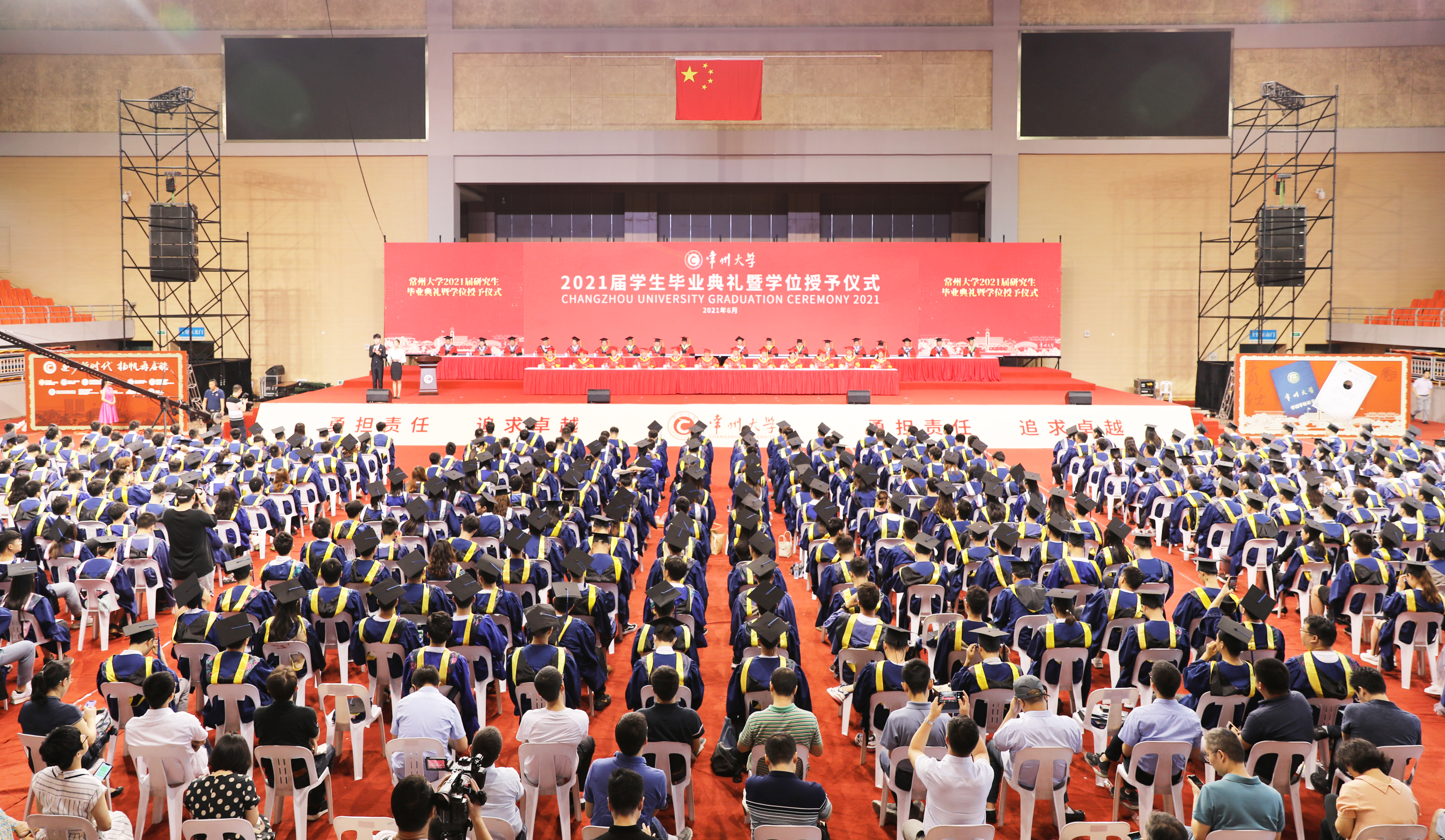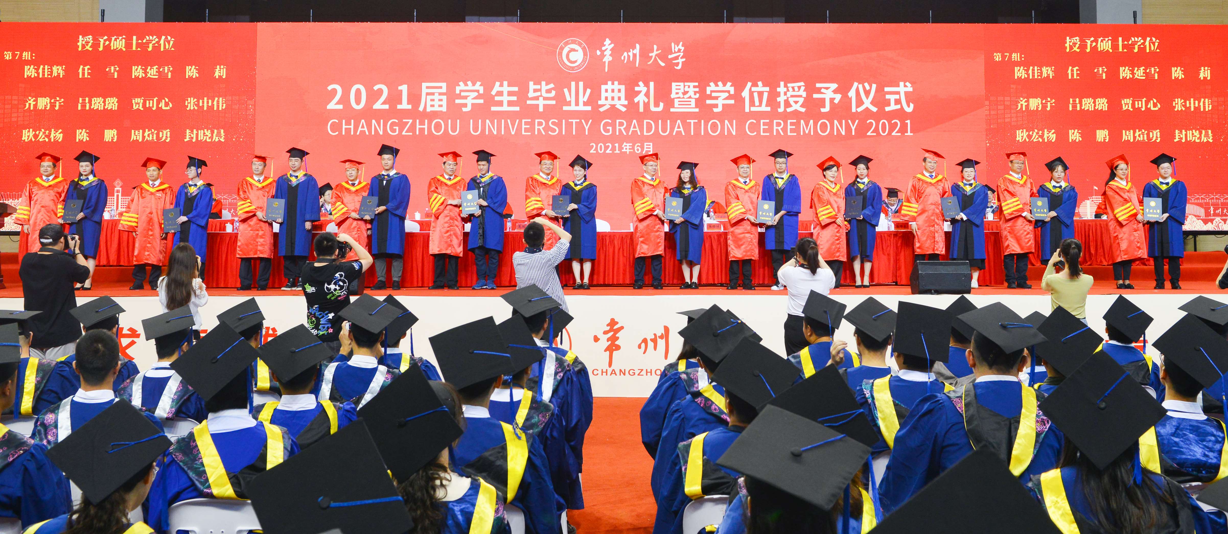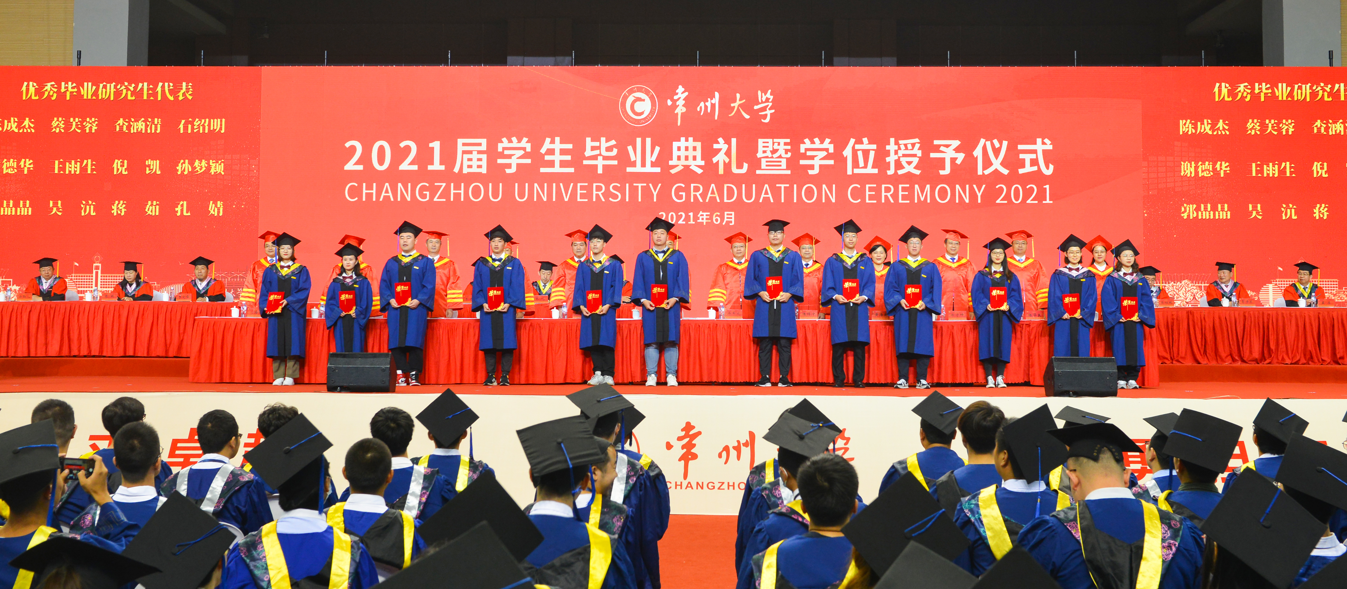 6月21日上午,常州大学2021届研究生毕业典礼暨学位授予仪式在科教城校区体育馆举行。819名2021届毕业生在这里快乐出发,开启新征程。校党委领导班子成员陈群、蒋军成、戴国洪、陆锦冲、苏旭平、黄海燕、徐树法、徐守坤、张宏如、陆华良、闫海波、杨琳,研究生院负责人,各学院学位评定分委员会主任委员,各学院研究生工作负责人、导师代表等,与毕业生们欢聚一堂,共同见证这一荣耀时刻。党委副书记、副校长戴国洪主持典礼。