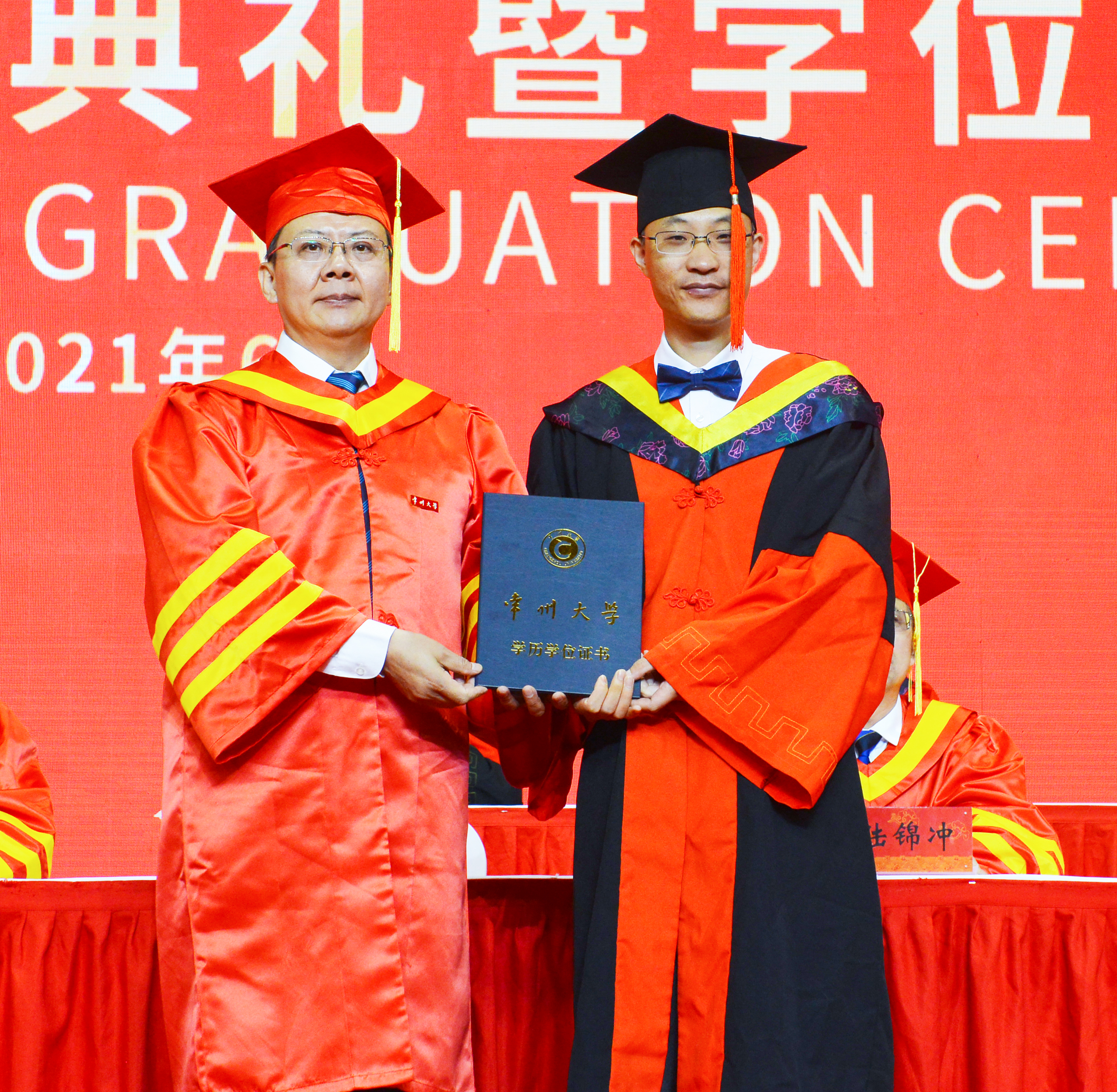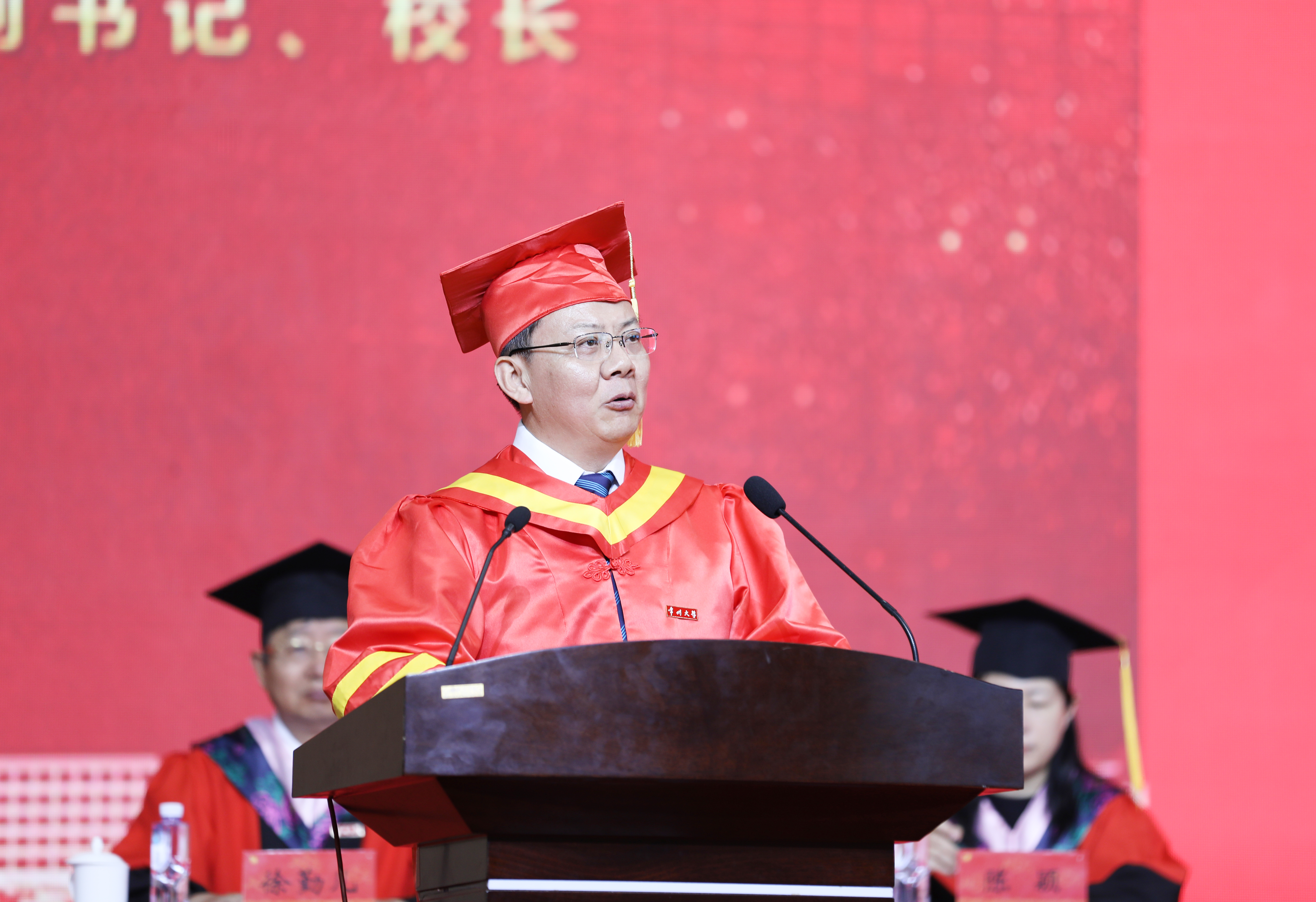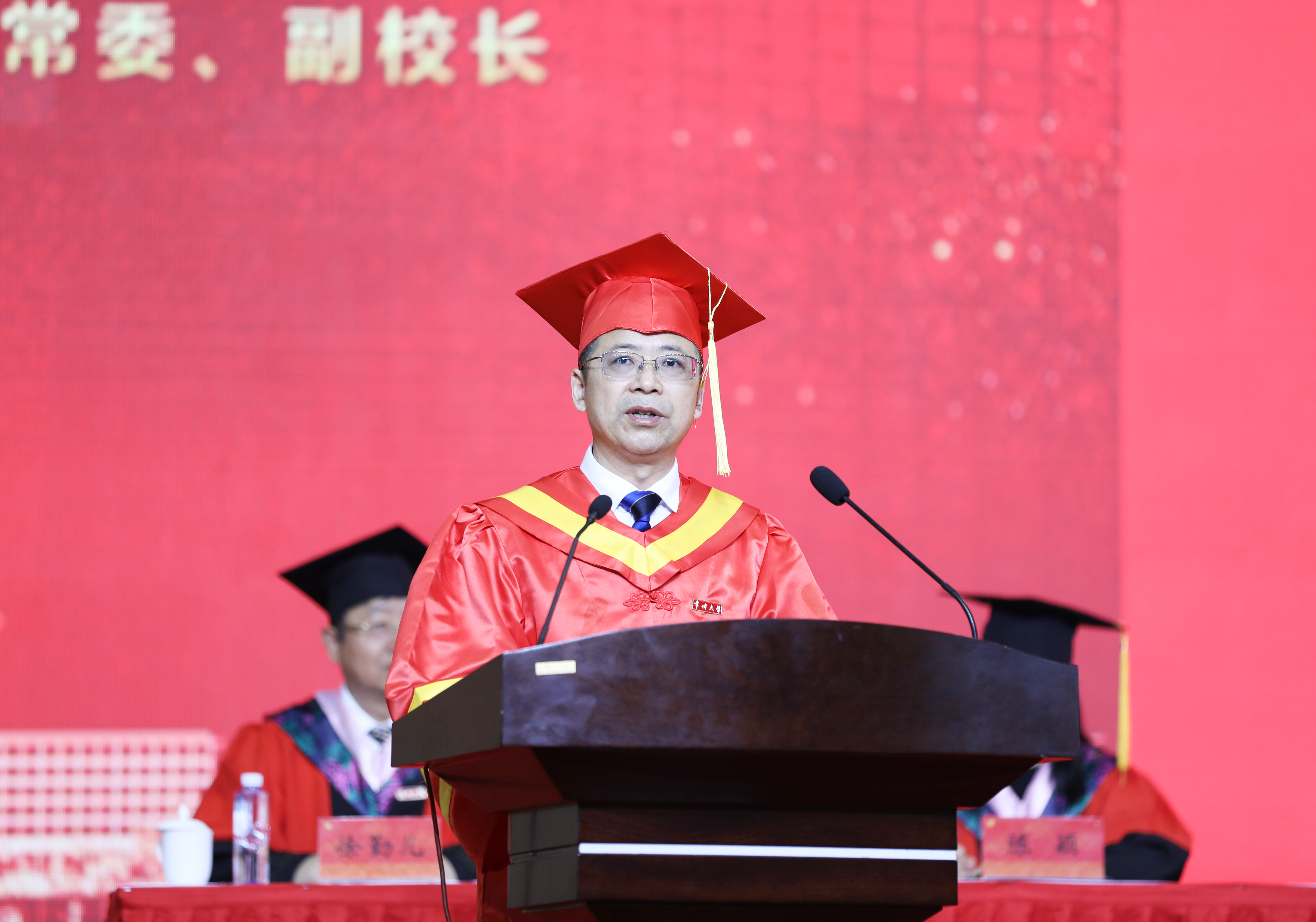6月21日上午,常州大学2021届研究生毕业典礼暨学位授予仪式在科教城校区体育馆举行。819名2021届毕业生在这里快乐出发,开启新征程。校党委领导班子成员陈群、蒋军成、戴国洪、陆锦冲、苏旭平、黄海燕、徐树法、徐守坤、张宏如、陆华良、闫海波、杨琳,研究生院负责人,各学院学位评定分委员会主任委员,各学院研究生工作负责人、导师代表等,与毕业生们欢聚一堂,共同见证这一荣耀时刻。党委副书记、副校长戴国洪主持典礼。