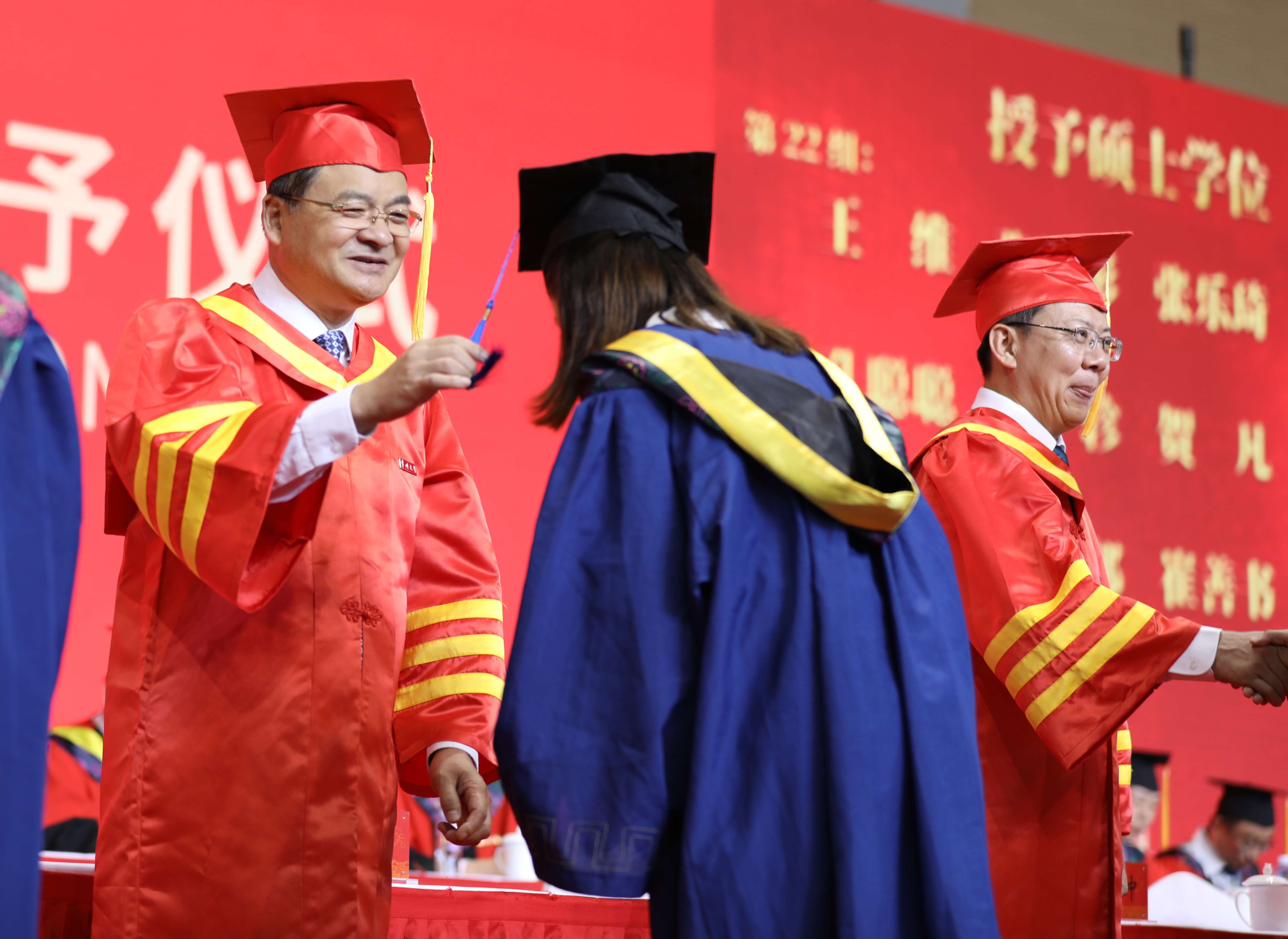 蒋军成作为校学位评定委员会主席为获得博士学位的毕业生一一扶正流苏、颁发学位证书;校党委领导班子为获得硕士学位的毕业生扶正流苏、颁发学位证书。