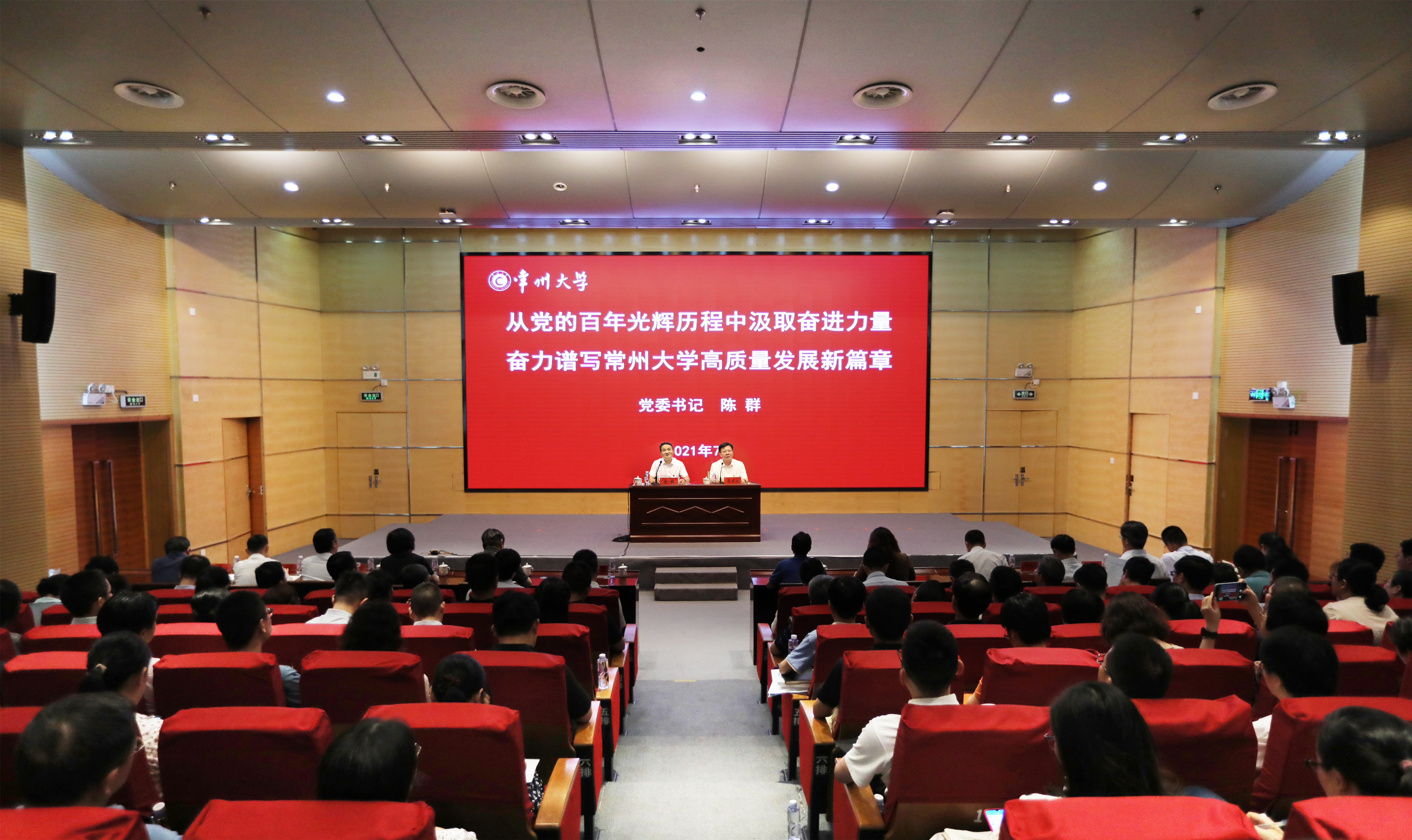 为深入学习贯彻习近平总书记“七一”重要讲话精神,进一步巩固党史学习教育成效,引导全体党员干部在党的百年奋斗历程中汲取精神力量,7月6日下午,校党委书记陈群在科教城校区文彰楼报告厅讲授题为《从党的百年光辉历程中汲取奋进力量 奋力谱写常州大学高质量发展新篇章》党史学习教育专题党课。省委教育工委党史学习教育派出第四指导组成员、盐城工学院马克思主义学院教授陈根、苏州大学马克思主义学院党委组织员蒋慧全程列席专题党课。全体校领导、校党委理论学习中心组成员、两委委员、中层干部现场聆听报告。党委副书记、校长蒋军成主持党课。