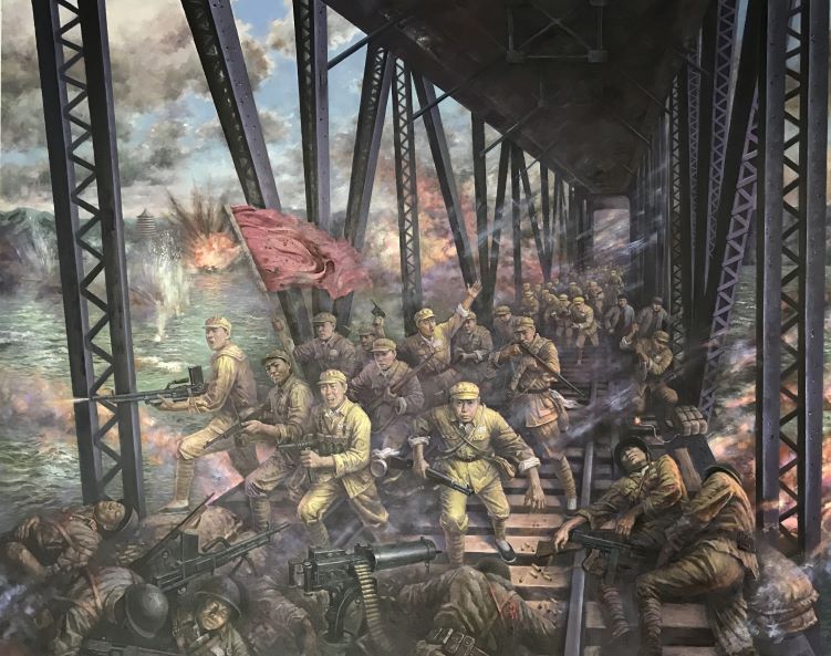 油画《保卫钱塘江大桥》(240cmx300cm),表现了1949年解放战争时期,国民党反动派准备炸断钱塘江大桥,企图阻止解放军南下。作品以写实的绘画艺术手法再现了这一历史事件,众多解放军战士在战火中冲向敌军,解放军战士张春霖发现被点燃导火索的炸药包,奋不顾身地用铁锹砍断了导火索,保卫了钱塘江大桥。画面在大桥两侧设计了飘动的硝烟、被炮弹炸起的水柱,增强了战斗气氛。为了准确把握历史,迟连城查阅了大量历史资料、图书、文献照片等,几易草图方案,最后确定了色彩小稿。创作过程中,迟连城老师专程到杭州参观钱塘江大桥和钱塘江大桥博物馆,对大桥的结构、形状特点、数据、历史等进行考察和了解。