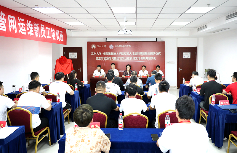 7月15日下午,常州大学-淮南职业技术学院专项人才培训共建基地揭牌仪式暨淮河能源燃气集团管网运维新员工培训班开班典礼举行。淮南职业技术学院党委书记、 董事长、校长吴新社,淮河能源燃气集团党委副书记、纪委书记、工会主席蔡学明,淮南职业技术学院党委委员、副校长王德恩,常州大学党委常委、副校长黄海燕出席活动。来自淮河能源燃气集团的31名管网运维新员工参加开班典礼。