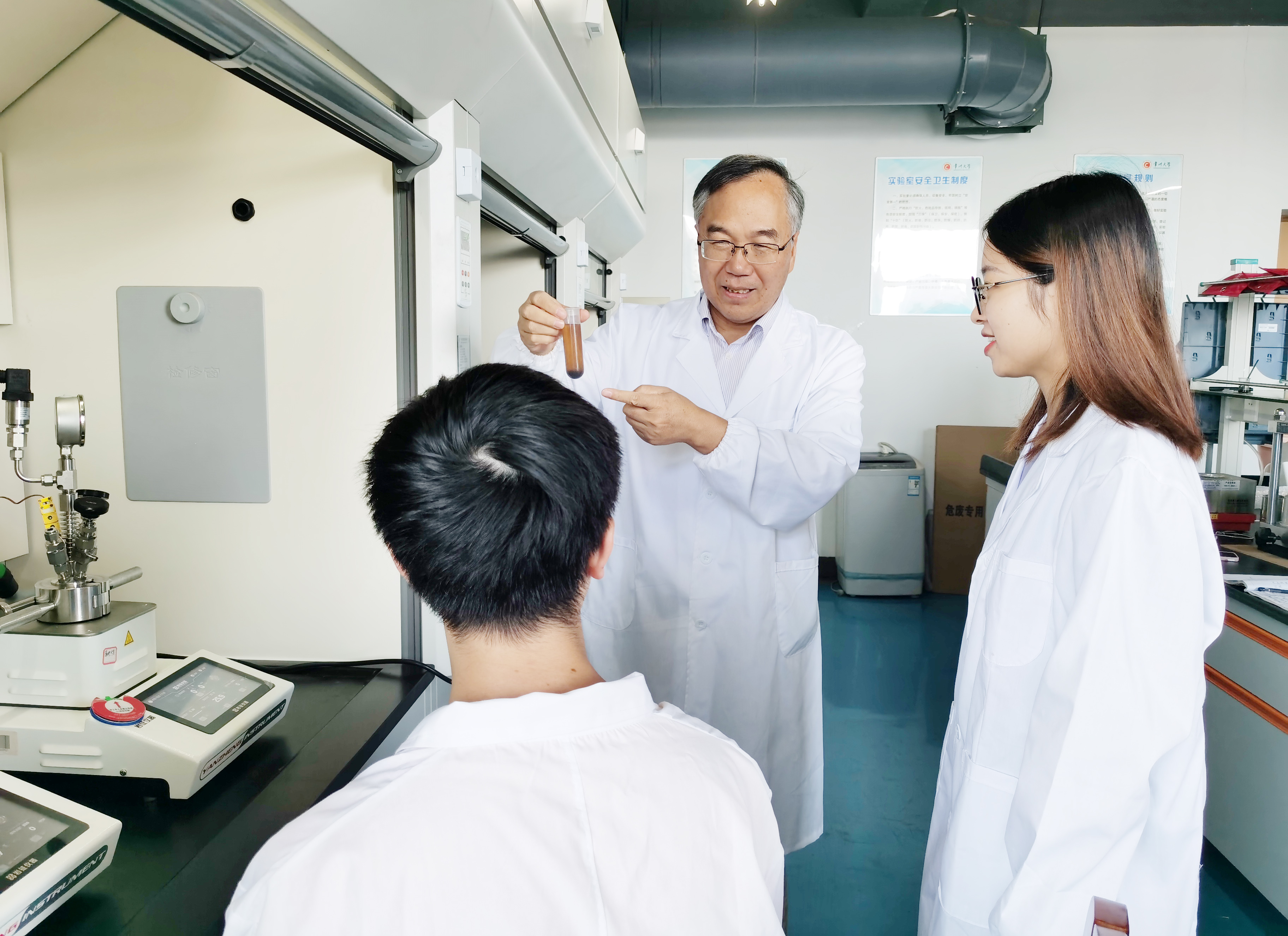郭向云(右二)与研究生讨论实验结果