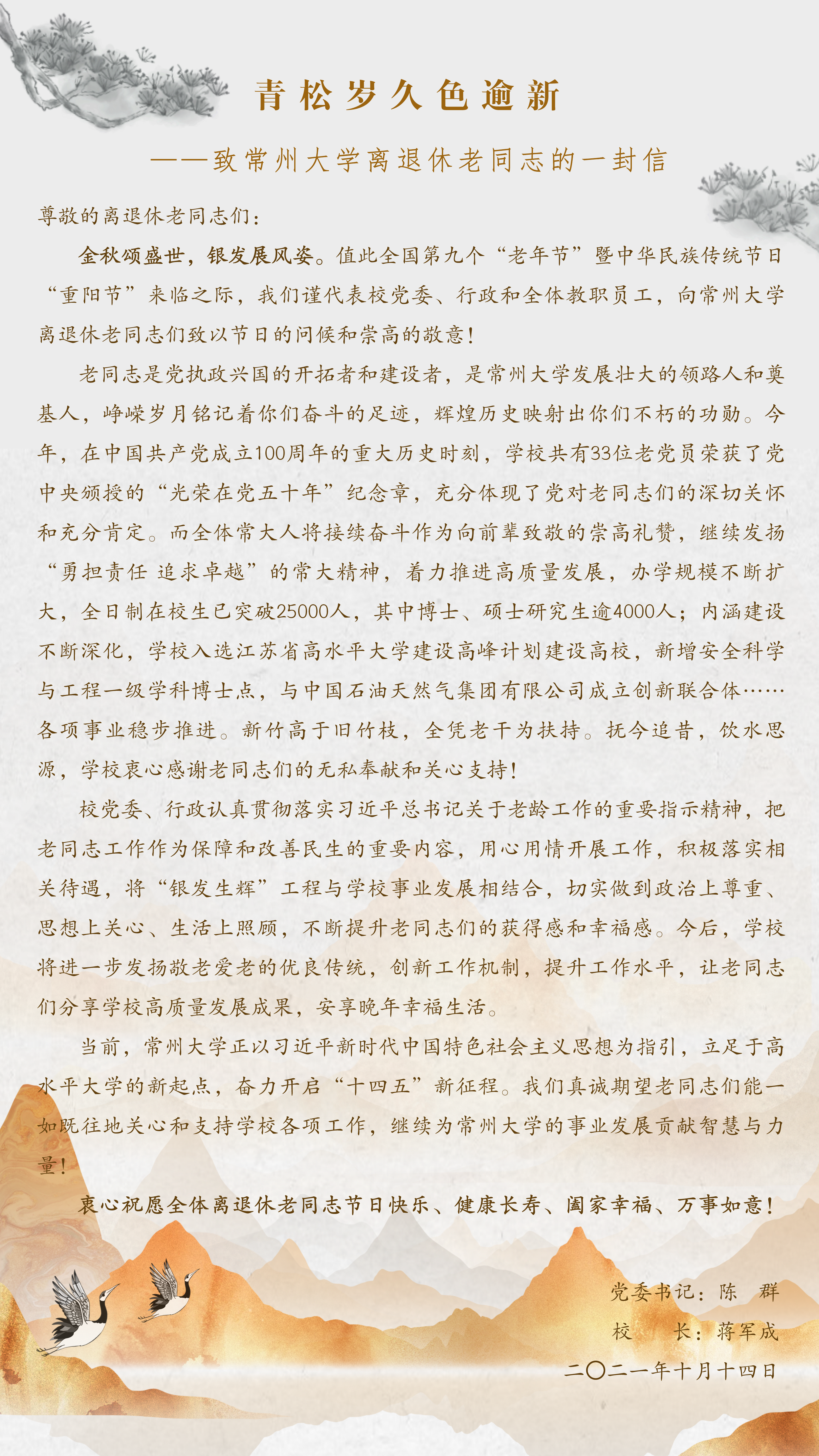 青松岁久色逾新——致常州大学离退休老同志的一封信