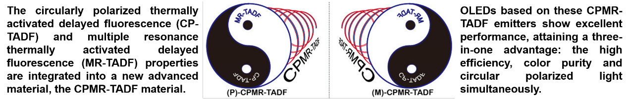 圆偏振—热激活延迟荧光(CP-TADF)材料由于其圆偏振发光、100%光利用率特性,被认为是极具发展潜力的新型发光材料,在光学存储、光学防伪、3D显示等方面具有重要应用。目前,大多数CP-TADF分子采用“手性微扰”策略,即通过价键共联碳手性、轴手性或面手性等手性源,实现CPL发光。但是,这些“手性微扰”的CP-TADF分子有其不足即给体—受体单元空间分离了前线轨道电子排布,导致发光光谱较宽,手性源没有参与到分子前线轨道电子排布,导致材料不对称因子(g值)普遍很小。