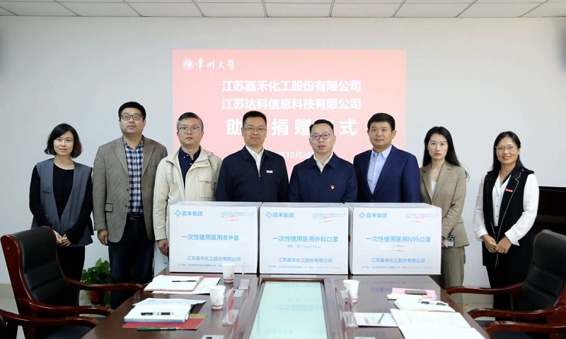 10月26日下午,江苏嘉禾化工股份有限公司董事长刘军峰、江苏达科信息科技有限公司董事长洪智—行来校捐赠助学防疫物资。党委常委、副校长徐守坤会见来宾,党委常委、总会计师陆华良出席捐赠仪式,国有资产管理处、后勤管理处、计算机与人工智能学院 阿里云大数据学院 软件学院相关负责人参加捐赠仪式。