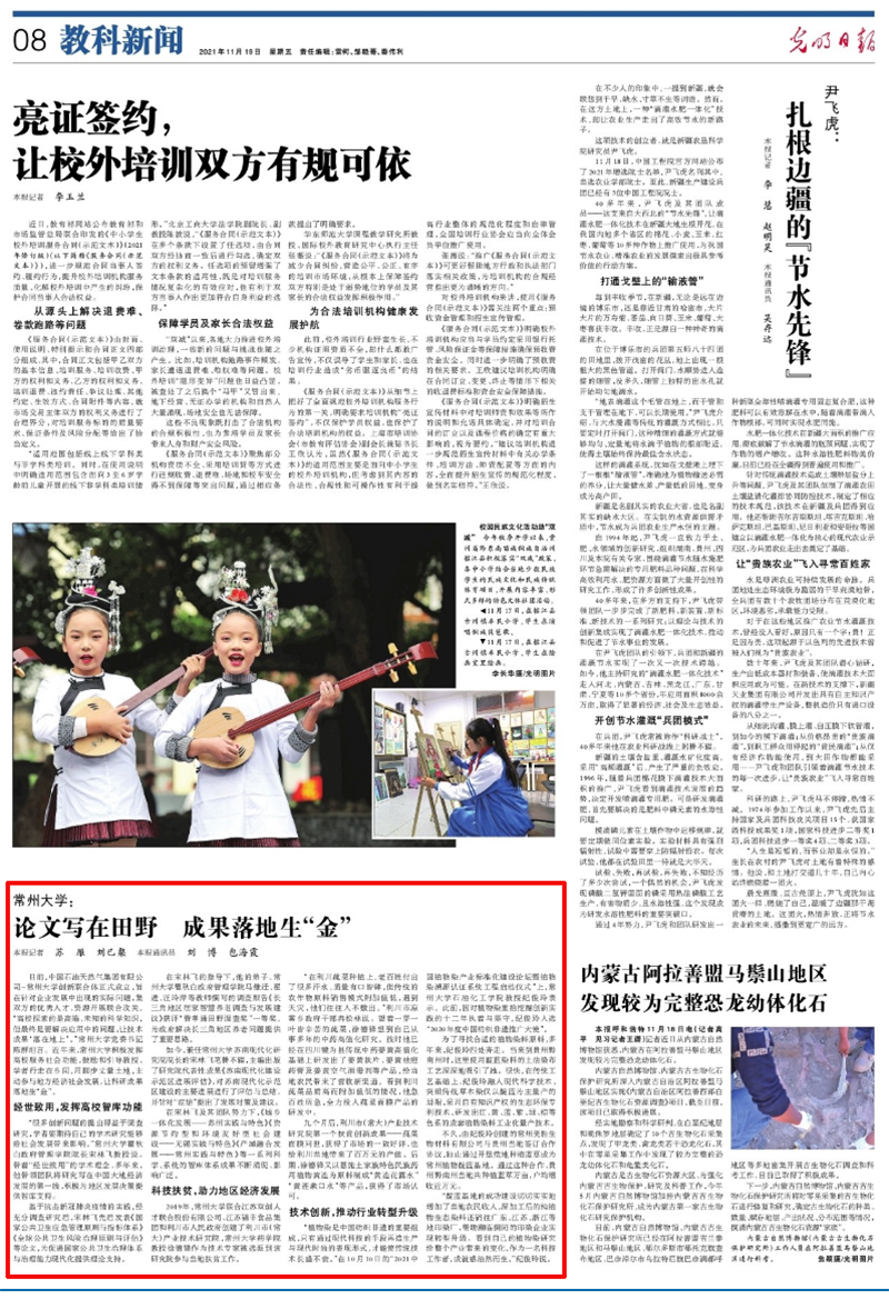 11月19日,光明日报以“论文写在田野 成果落地生‘金’”为题,从“经世致用,发挥高校智库功能”“科技扶贫,助力地区经济发展”“技术创新,推动行业转型升级”等方面报道我校积极发挥高校服务社会功能,鼓励和引导教授、学者行走在乡间,用脚步丈量土地,主动参与地方经济社会发展,让科研成果落地生“金”。中共江苏省委组织部官网、交汇点同步报道。