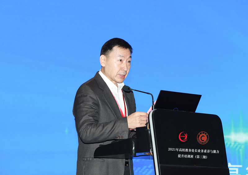 武世兴作题为《把握要求 狠抓落实 不断推进高等教育高质量发展》大会主旨报告。他围绕学习贯彻落实习近平总书记关于高等教育的最新重要论述及党的十九届六中全会精神,就聚焦高等教育质量发展、构建高质量高等教育体系、全面推进“四新”建设、抓好人才培养“新基建”等方面作深入解读。他指出,高校教务处处长要适应我国高等教育进入世界高等教育第一方阵的新形势新要求,推动高等教育提质创新,推进“新工科、新医科、新农科、新文科”建设,抓好专业、课程、教材、技术四项“新基建”,努力走好人才自主培养之路,为高等教育高质量发展体系建设做出积极贡献。