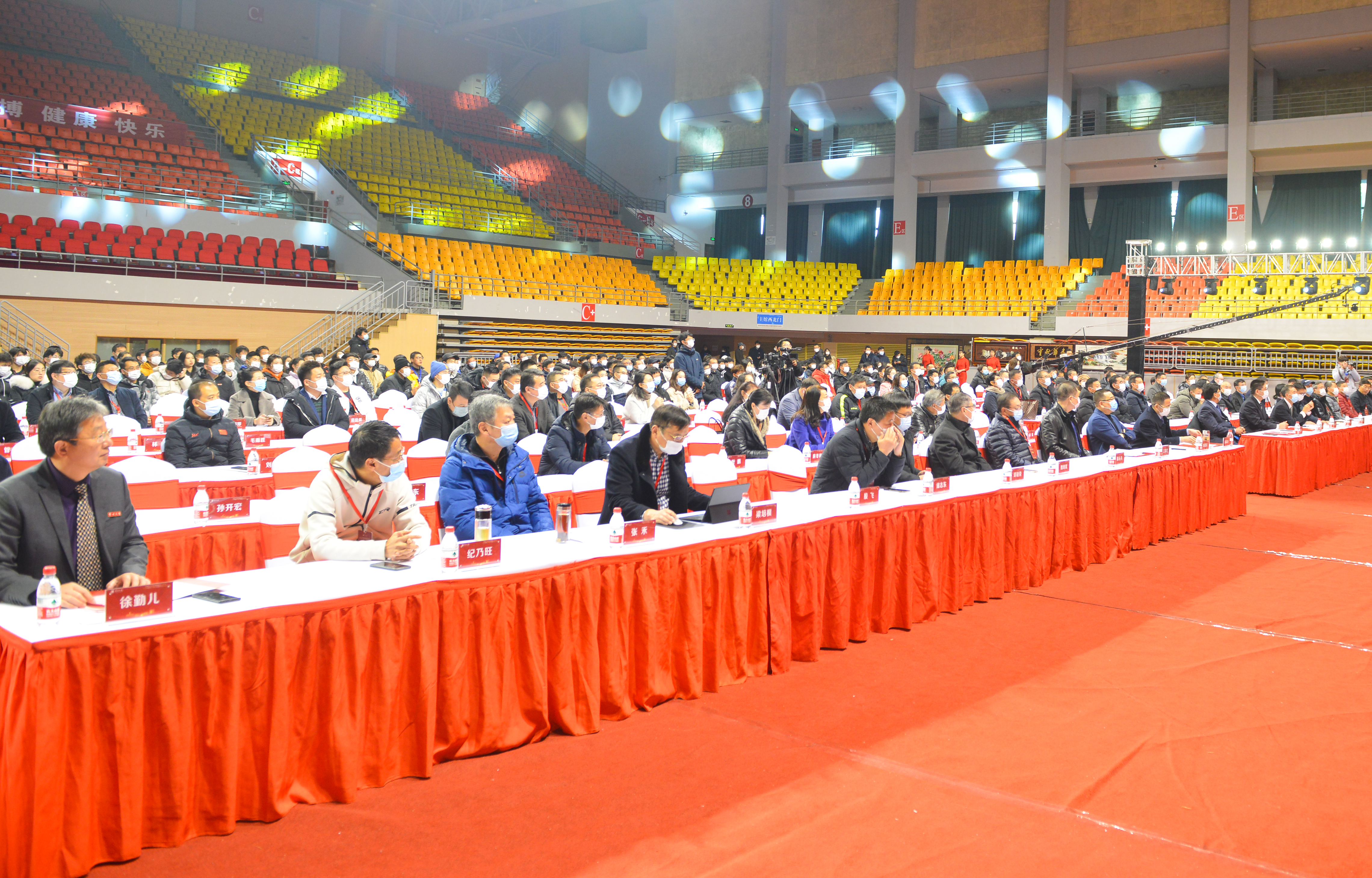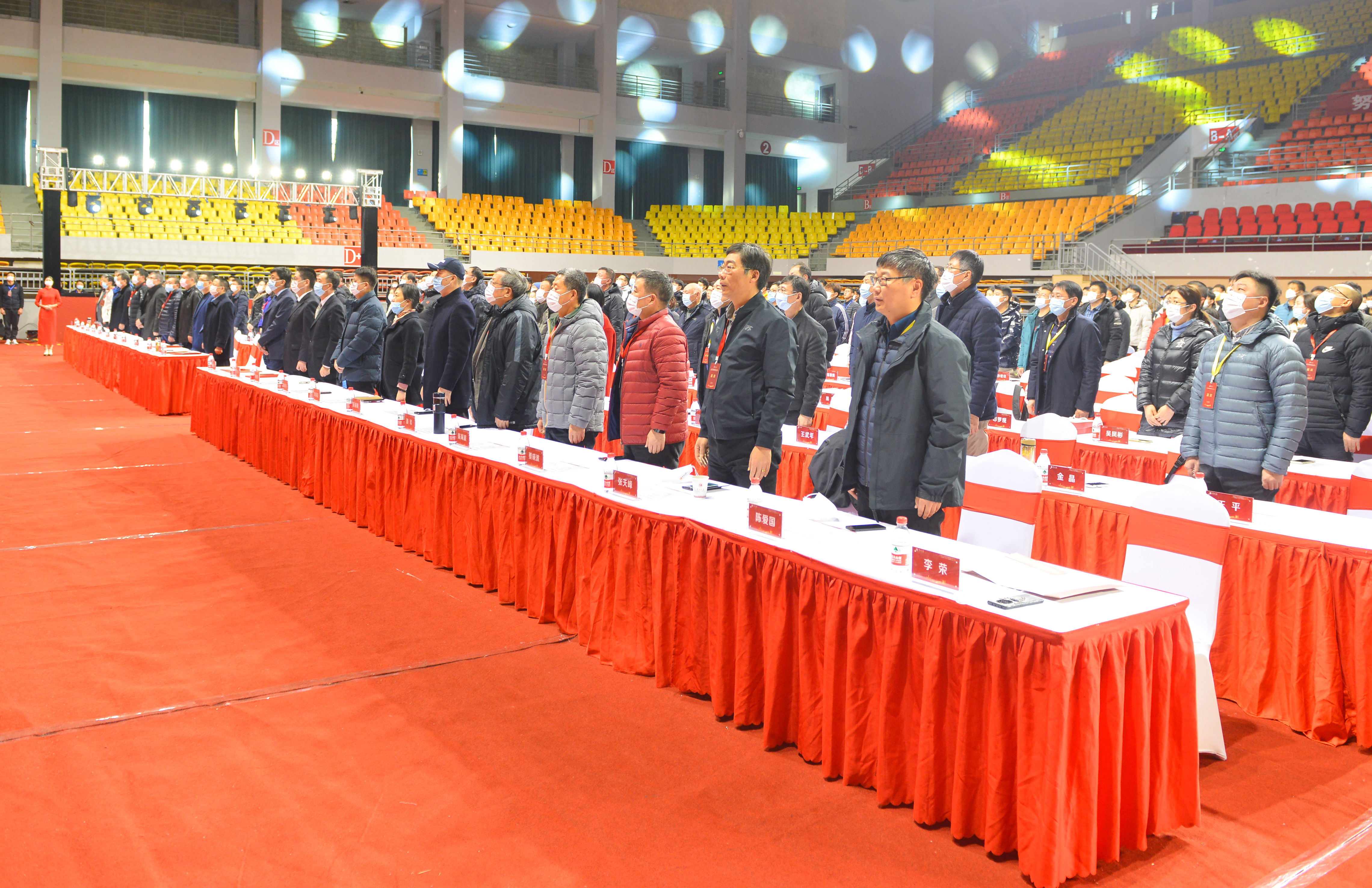在雄壮的国歌声中,全场嘉宾起身面向国旗行注目礼、齐唱国歌。