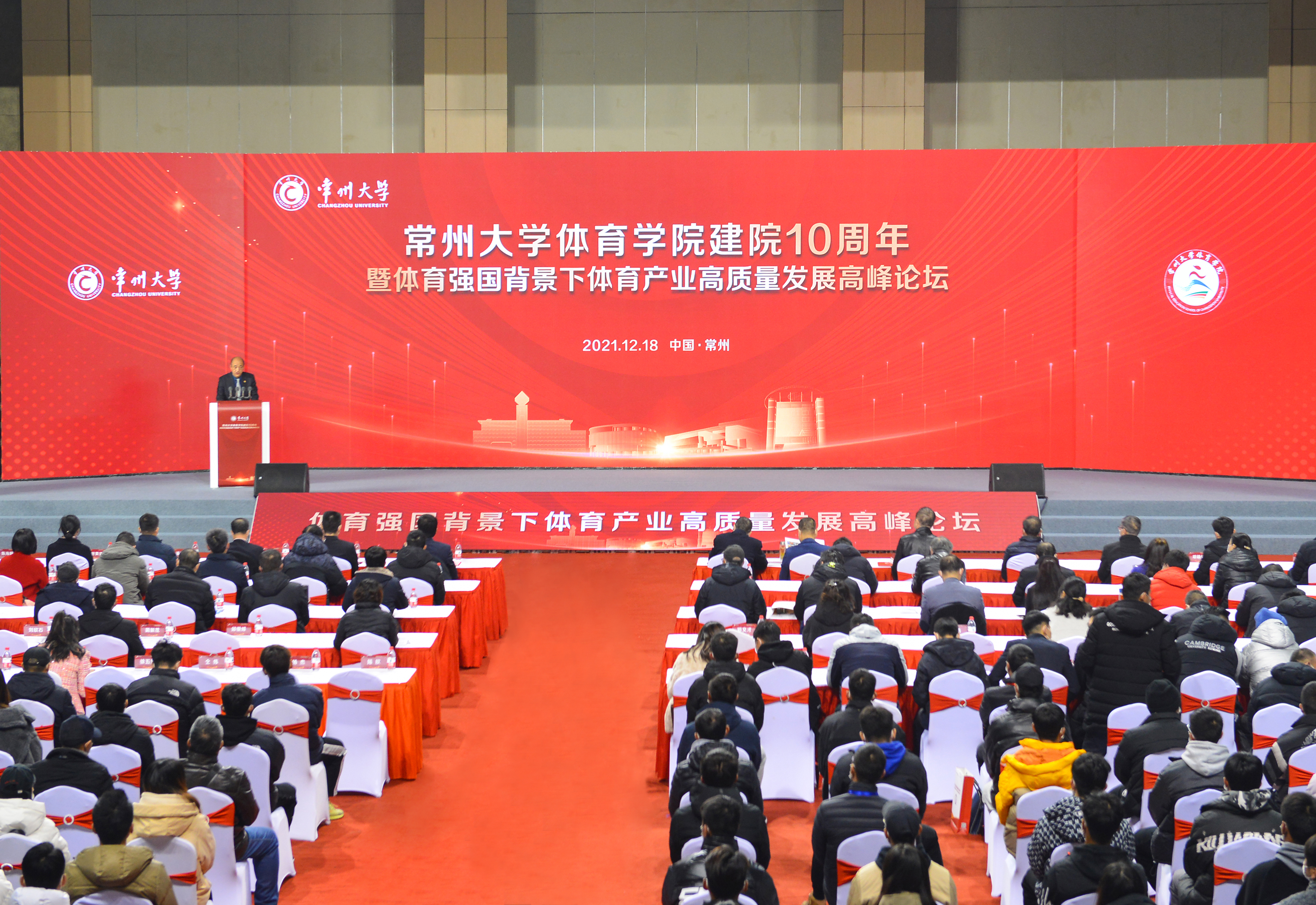 12月18日,常州大学体育学院建院10周年暨体育强国背景下体育产业高质量发展高峰论坛开幕式在科教城校区体育馆举行。徐州工程学院党委书记、校长陈奎庆,江苏省高校体育教学指导委员会主任、南京体育学院校长杨国庆,江苏省体育局副局长熊伟,国务院学位委员会第五、第六、第七届体育学科评议组成员、全国高校体育教学指导委员会技术学科组组长王家宏,世界休闲体育协会轮值主席李相如,常州大学党委常委、副校长陆锦冲出席开幕式。来自北京体育大学、首都体育学院、南京体育学院、苏州大学、南京师范大学、扬州大学、南京大学、东南大学等省内外40余所高校的专家学者,合作企事业单位相关负责人,校友代表和体育学院师生300多人参加开幕式。