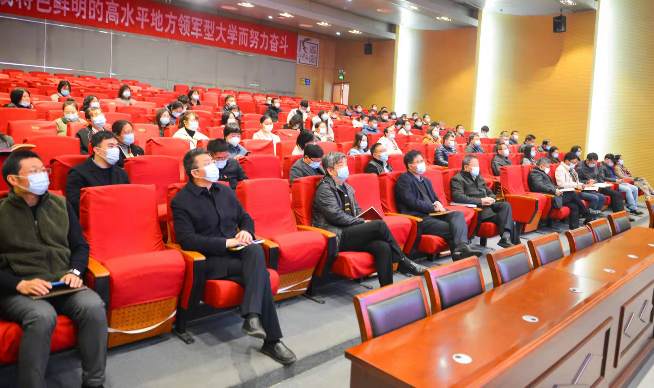12月21日上午,我校举行学习贯彻党的十九届六中全会精神省委宣讲团宣讲报告会暨校党委理论学习中心组学习会。省委宣讲团成员、江苏省政府参事室原主任、江苏省社会科学院原院长、常州大学瞿秋白政府管理学院院长宋林飞作宣讲报告,省委教育工委党史学习教育派出第四指导组成员、盐城工学院马克思主义学院陈根教授,指导组成员、苏州大学马克思主义学院党委组织员蒋慧老师通过线上方式列席专题学习。报告会共分为科教城校区文正楼第二会议室主会场和文彰楼报告厅分会场两个会场,校领导、校党委理论学习中心组成员、民主党派统战团体负责人、机关党员干部、马克思主义学院教师代表、辅导员代表、学生党员代表聆听了报告。党委副书记、校长蒋军成主持宣讲报告会及专题学习会。