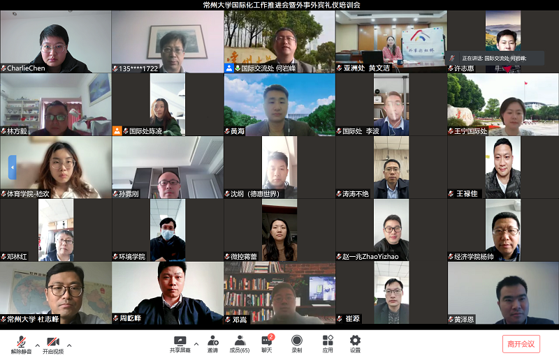 为推进学校高质量完成高水平大学高峰建设计划和“十四五”规划中国际化方面的重点任务,3月30日下午,我校在线上举行2022年常州大学国际化工作推进会。常州大学党委常委、副校长徐守坤,常州市政府外事办公室亚洲处处长黄文洁,常州大学国际交流处、海外教育学院、港澳台事务办公室全体工作人员、各学院外事工作负责人和联系人、国际化教育教学改革和创新课题负责人参加会议。国际交流处、海外教育学院负责人主持会议。