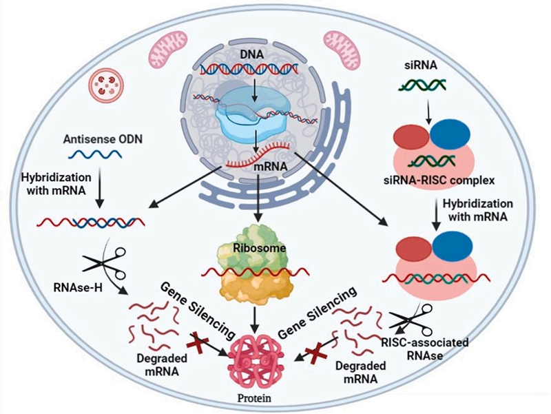 图2. mRNA, siRNA, 反义寡核苷酸的细胞内通路示意图。