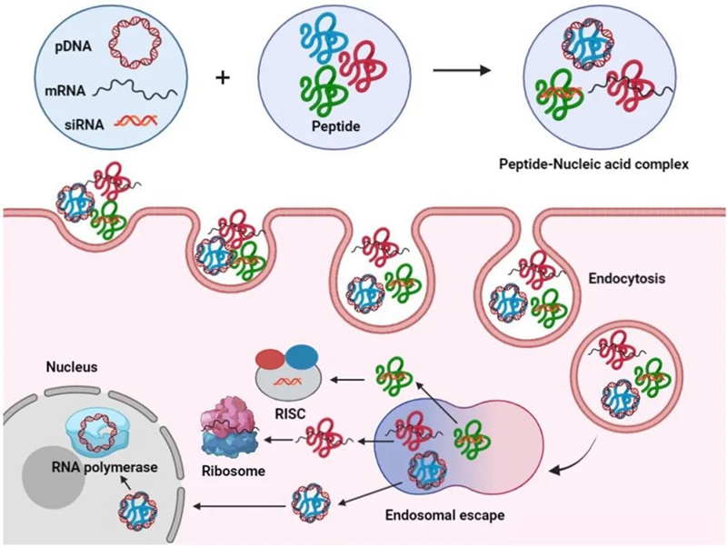 图1. 多肽递送质粒DNA(pDNA)、mRNA、siRNA的示意图。多肽先与核酸通过静电作用形成纳米颗粒复合体,通过内吞作用将其转运到细胞内,再从内涵体逃逸,将核酸释放到细胞质或细胞核内。