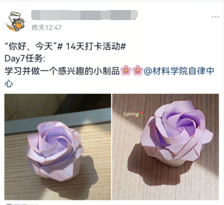 日前,材料学院开展“你好,今天”14天自律打卡活动,电影读后感、折纸、健身打卡、宅学笔记……同学们踊跃报名参与,帮助同学们养成良好习惯。