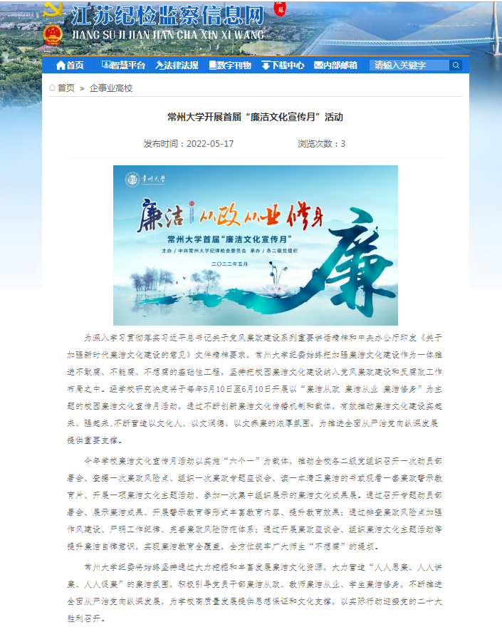 5月17日,江苏纪检监察信息网对我校开展首届“廉洁文化宣传月”活动进行专题报道,对我校不断创新廉洁文化传播机制和载体,有效推动廉洁文化建设实起来、强起来,不断营造以文化人、以文润德、以文养廉的浓厚氛围表示肯定。