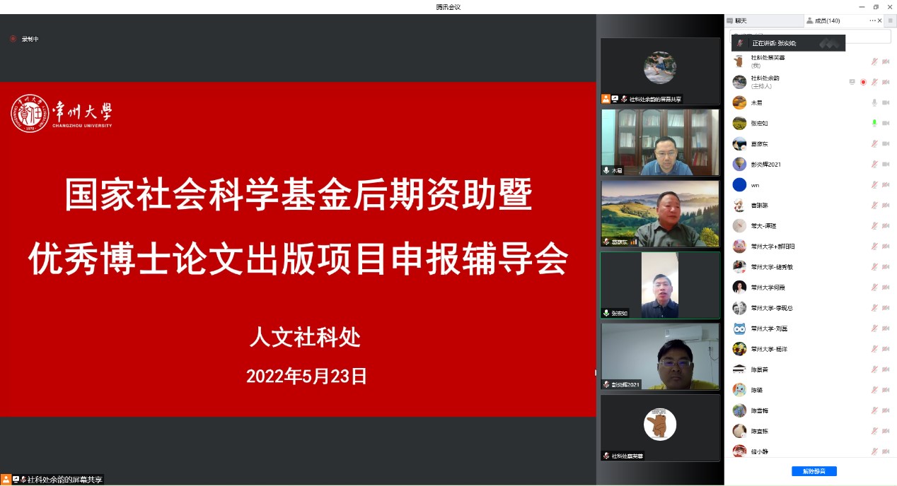 5月23日晚,我校通过线上会议举办2022年度国家社会科学基金后期资助暨优秀博士论文出版项目申报辅导会,会议邀请了暨南大学社科处副处长杨杰作了题为《国家社科基金后期资助项目申报解读》专题报告。党委常委、副校长张宏如参加会议并致辞,各文科学院相关负责人,拟申报老师,社科处、中吴智库全体工作人员等150余人参加报告会,人文社科处负责人主持报告。