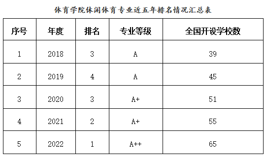 近日,中国管理科学研究院武书连教授主持的《2022中国大学评价》大学排行榜公布,我校体育学院休闲体育专业在专业排行中获评A++等级,在全国65家开设此专业的高校中排名第1位,这也是休闲体育专业连续第5年获评A等级。