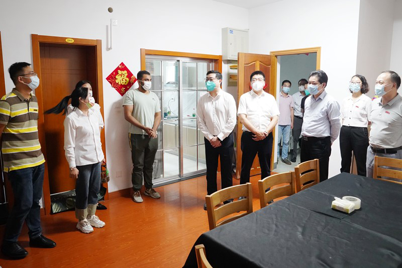 9月20日下午,武进区委副书记吴震宇带队督察学校疫情防控工作。科教城管委会副主任路军方、西湖街道党工委书记黄铁梅,疫情防控“五大员”随行督察。党委副书记、副校长戴国洪,党办校办、人事处、研工部、学工处、国际处、保卫处、后管处、西太湖校区管委会、后服中心等部门负责人陪同督查。