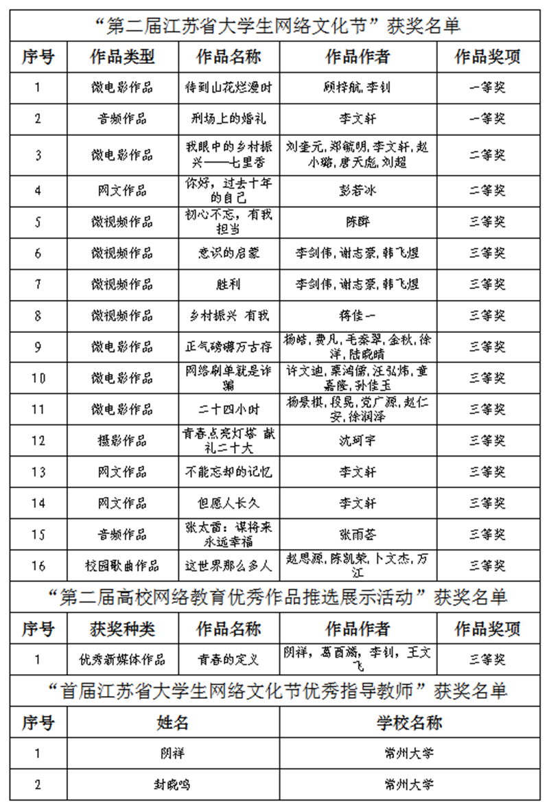 近日,江苏省委教育工委、省教育厅公布第二届江苏省大学生网络文化节和高校网络教育优秀作品推选展示活动遴选结果,我校共有17件作品获奖,较去年有大幅度提升。其中,获大学生网络文化节作品一等奖2项,二等奖2项,三等奖12项;高校网络教育优秀作品三等奖1项;我校教师阴祥、封晓鸣获评首届江苏省大学生网络文化节“优秀指导教师”称号。