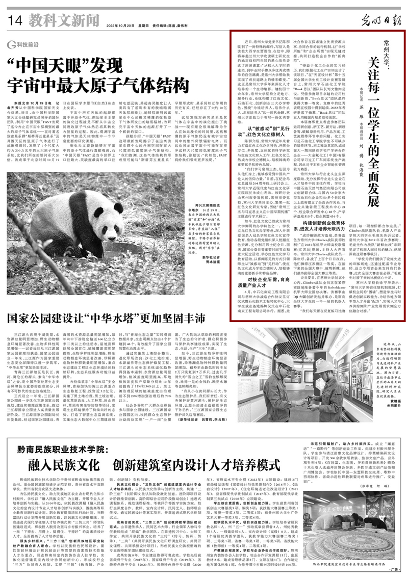 10月20日,在党的二十大胜利召开之际,光明日报以“常州大学:关注每一位学生的全面发展”为题,围绕学校红色文化、石油石化、创新创业三大办学特色,就“从‘被感动’到‘见行动’,红色文化立德树人”“对接企业所需,育高质量产业人才”“构建创新创业教育体系,迸发人才培养无限活力”等方面深度报道了我校人才培养成果。