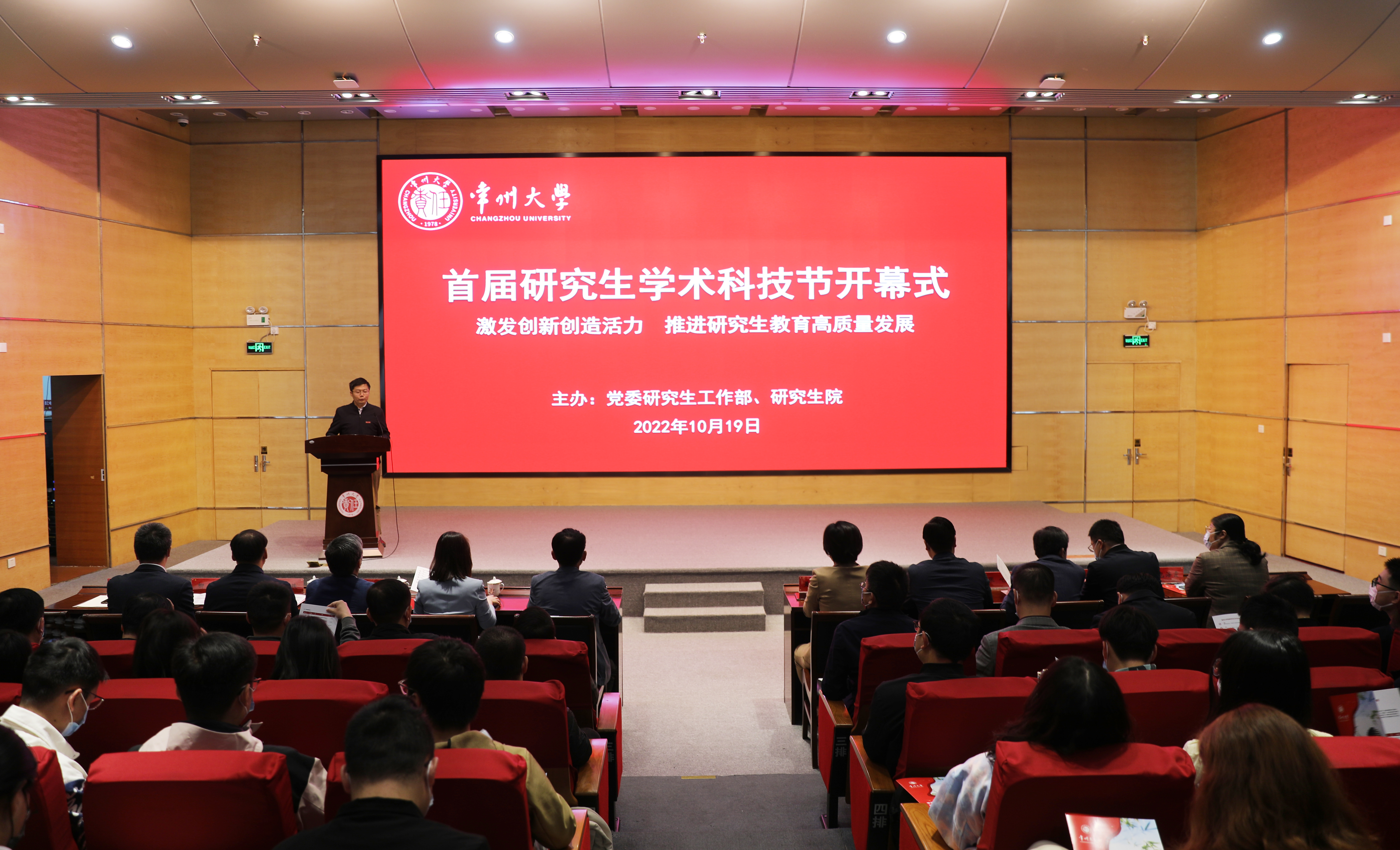 10月19日上午,以“激发创新创造活力 推进研究生教育高质量发展”为主题的常州大学首届研究生学术科技节在文彰楼报告厅拉开帷幕。党委常委、副校长黄海燕出席开幕式并致辞。学校相关职能部门负责人,各研究生培养学院院长、副院长,导师代表、辅导员及研究生代表260余人参加活动。