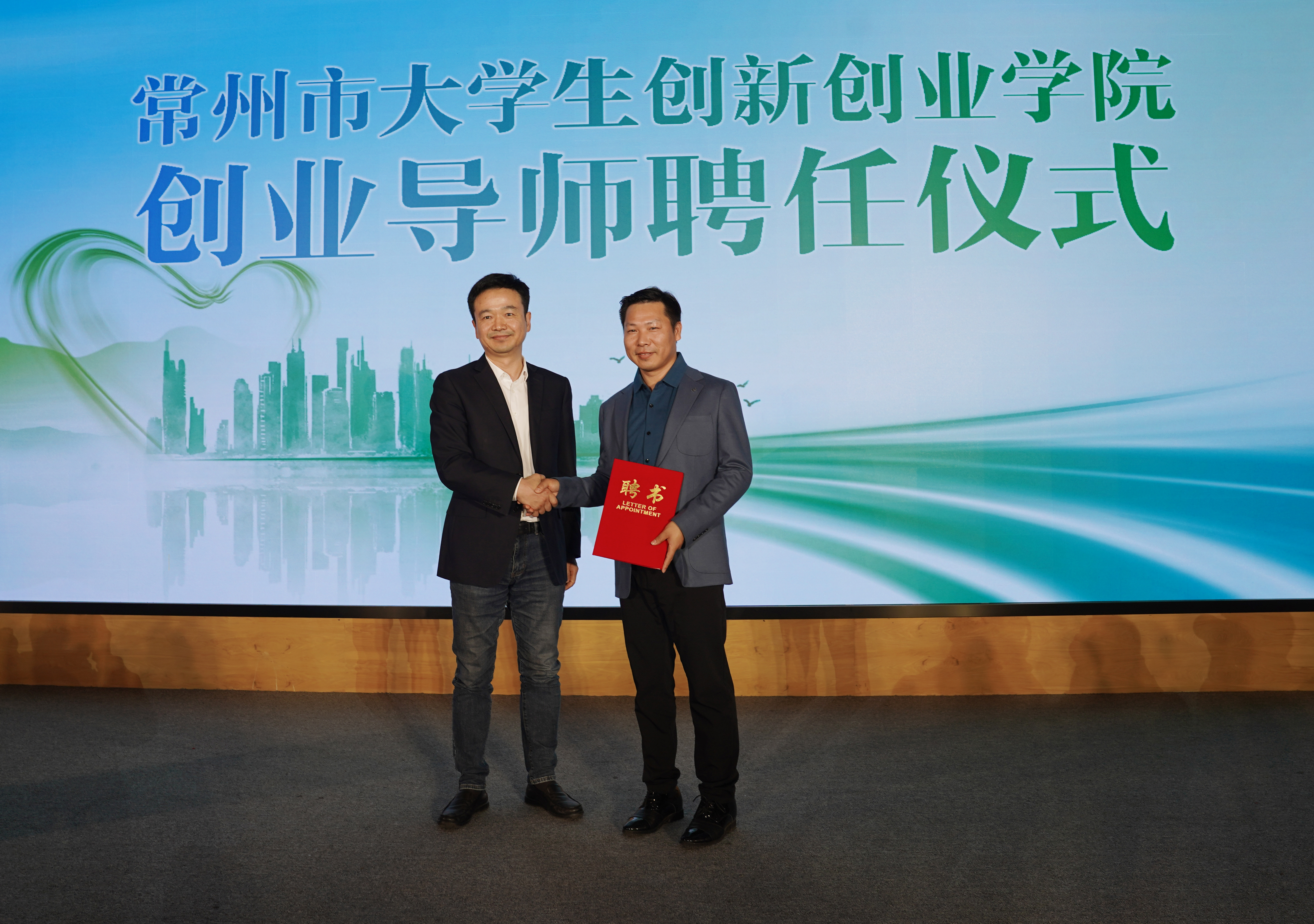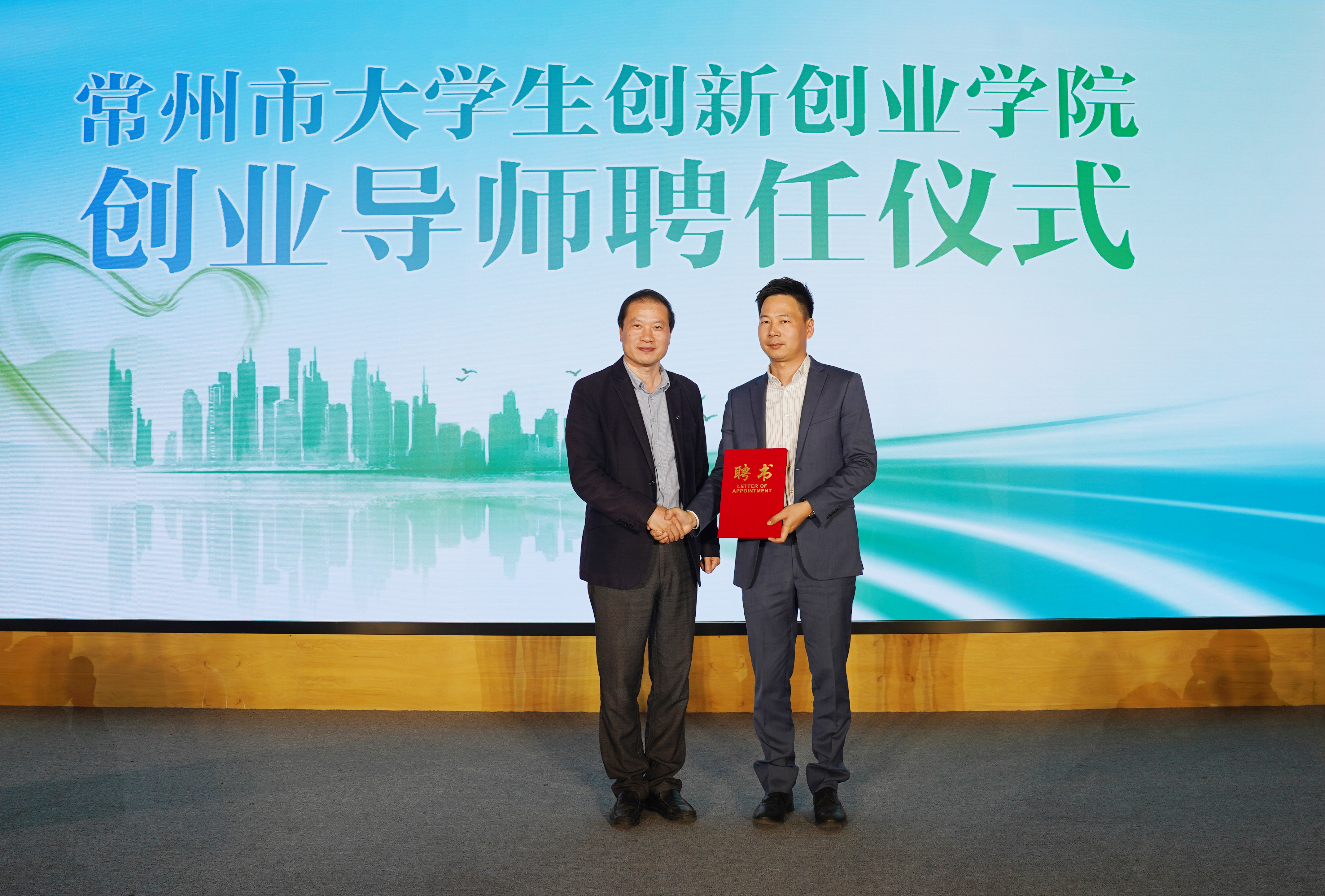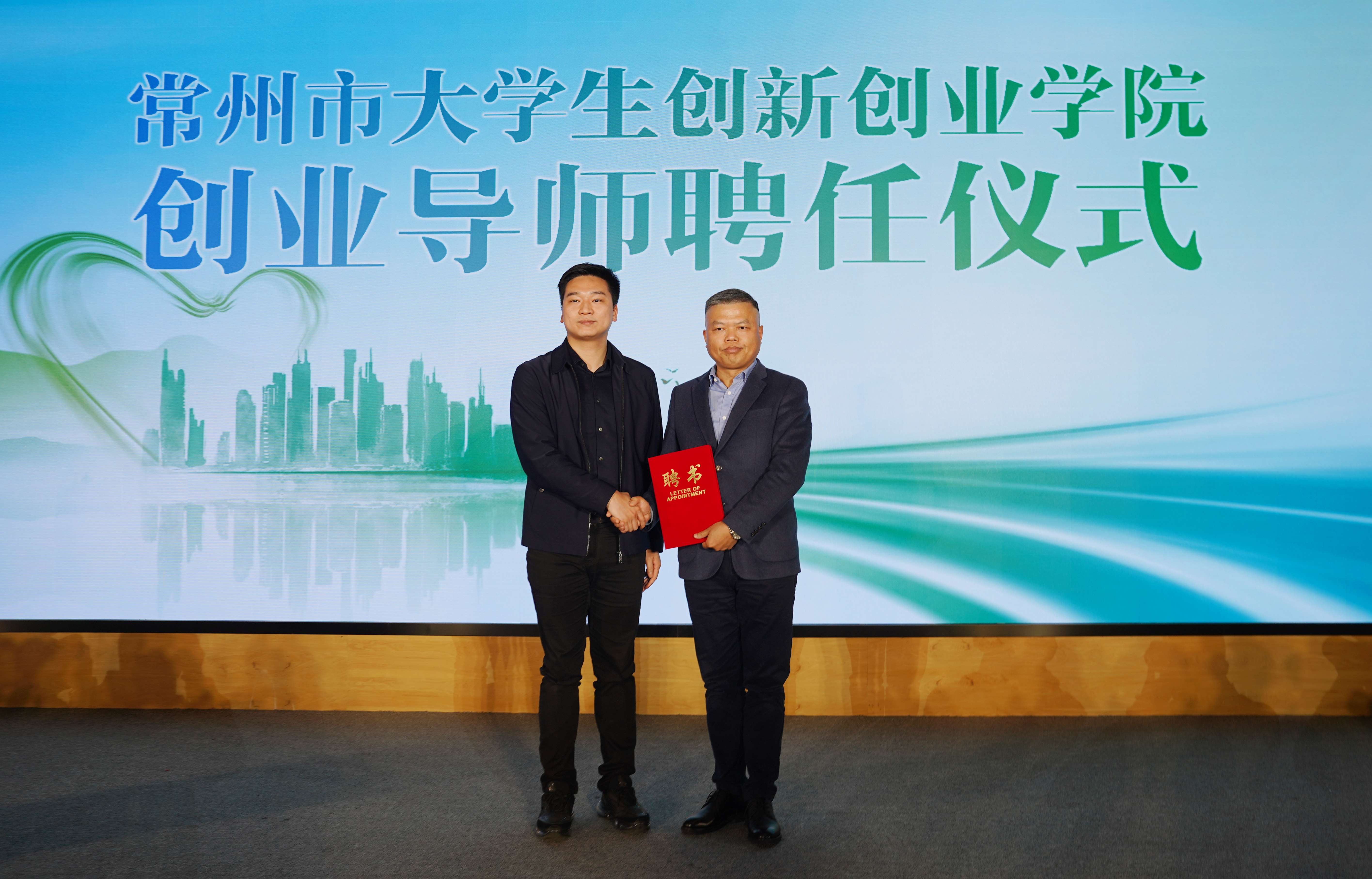 常州大学创新创业教育办公室主任江一山、共青团常州市委副书记黄泽欣、常州市人力资源和就业创业管理中心副主任宗涛分别为特邀创业指导专家壹米创新科技(常州)有限公司总裁蔡生祥、常州晋星私募基金管理有限公司董事长沈建明、力中投资创始合伙人姚中彬颁发常州市大学生创新创业学院创业导师聘书。