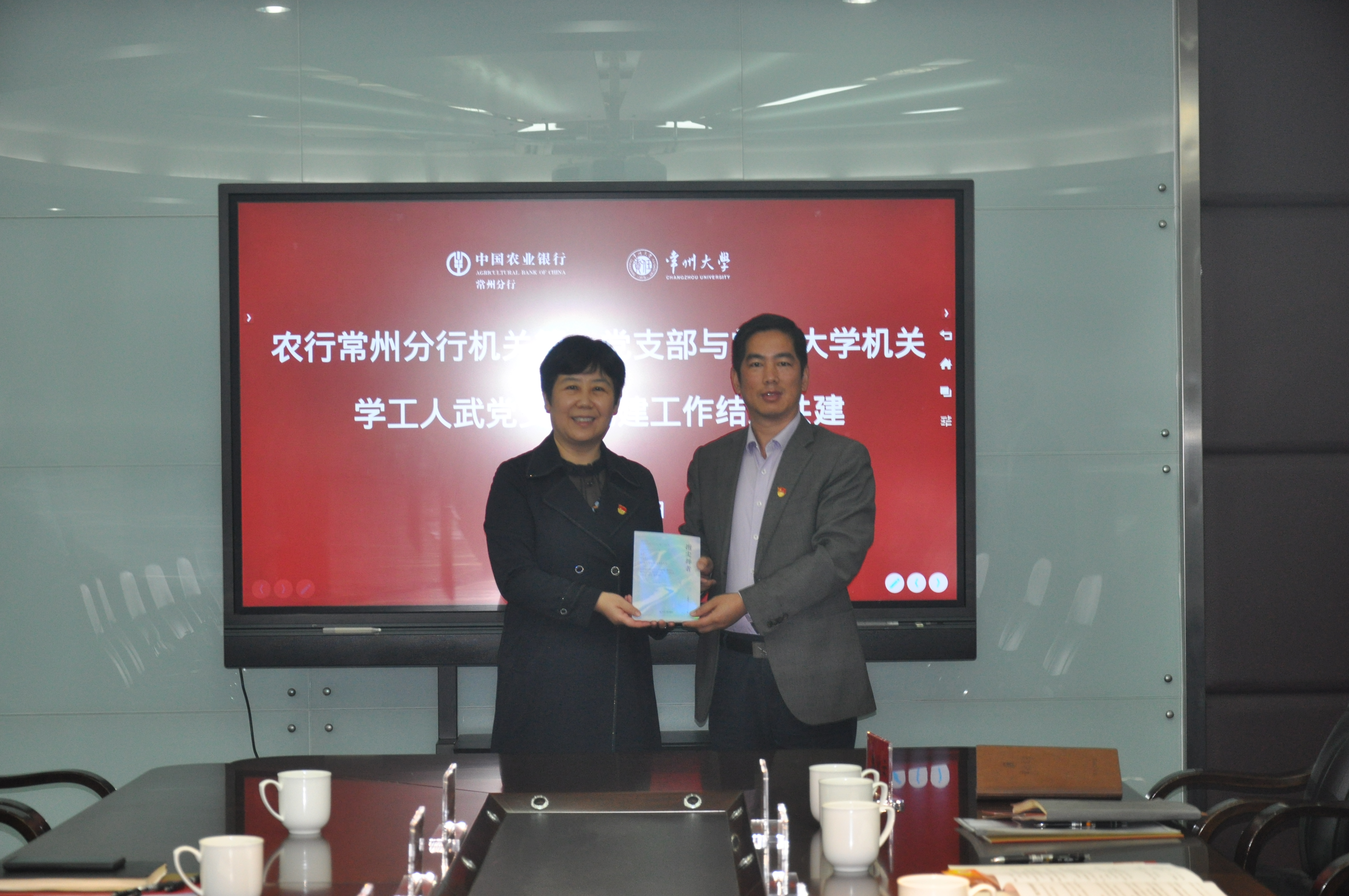 常州大学机关学工人武党支部与中国农业银行常州分行机关第一党支部共同签署党建工作结对共建协议书,王东云向支部赠送了书籍。