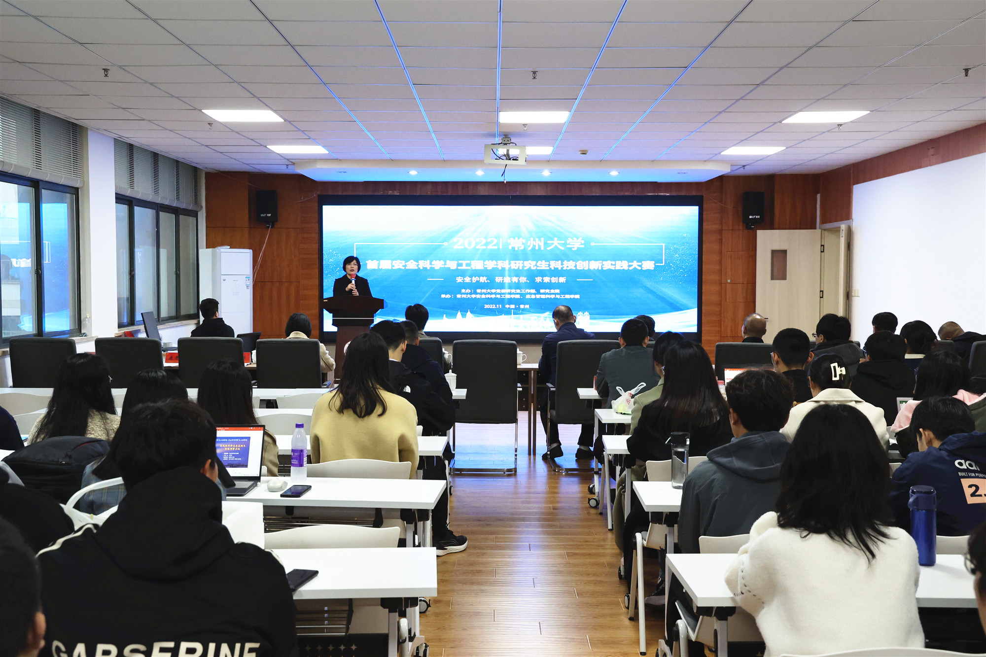 11月18日下午,安全科学与工程学院 应急管理科学与工程学院承办的常州大学首届安全学科研究生创新实践大赛在科教城校区逸夫楼516报告厅举办。大赛以“安全护航 研途有你 求索创新”为主题,瞄准安全学科前沿,意在引导和激发学生刻苦钻研、勇于挑战的求学精神,鼓励学生钻研安全学术前沿成果和热点问题。党委常委、副校长黄海燕,研究生院、安全科学与工程学院相关负责人和评委专家出席开幕式。安全科学与工程学院院长邢志祥主持开幕式。