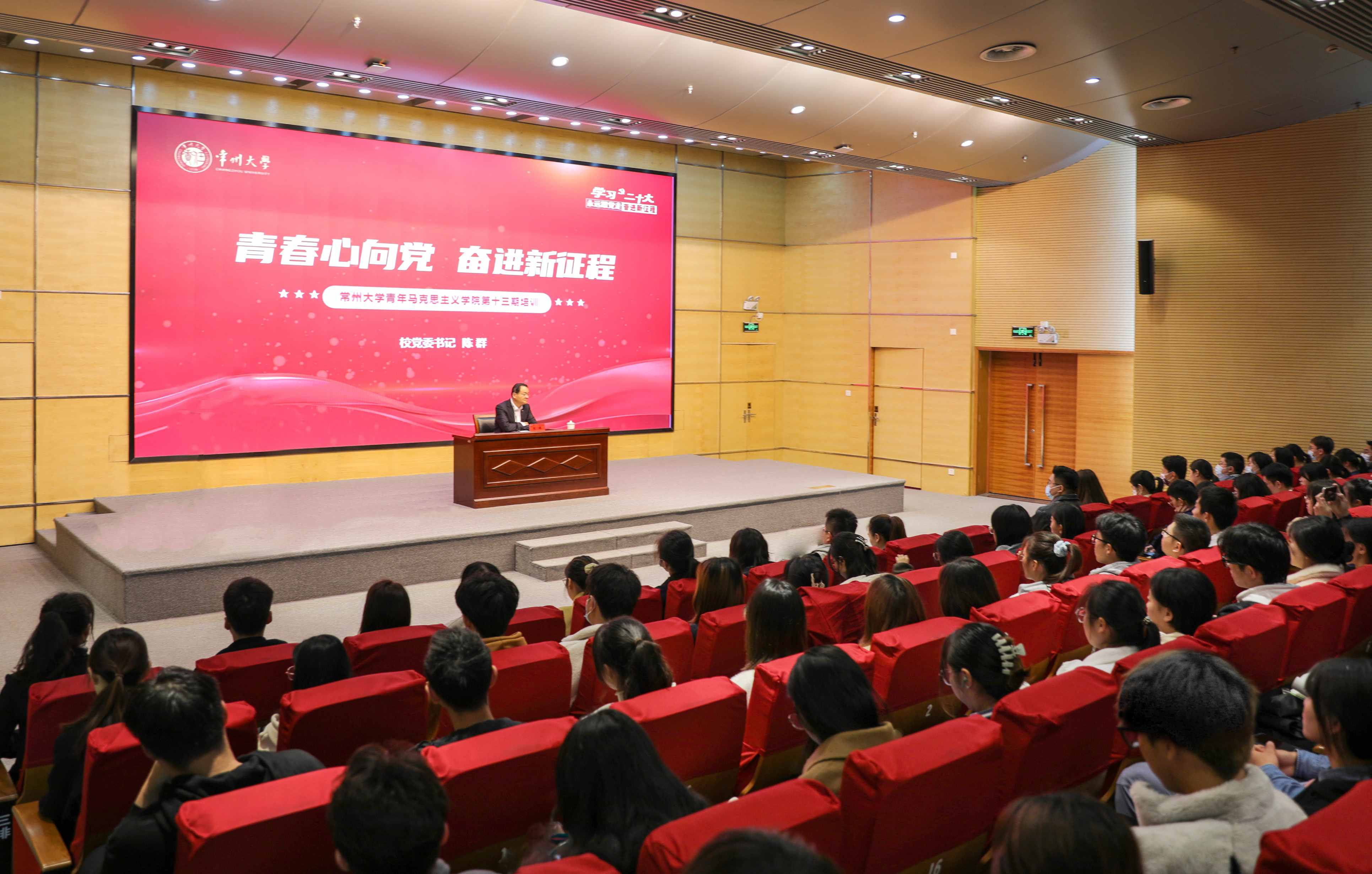 11月22日上午,党委书记陈群为常州大学青年马克思主义学院第十三期暨2022年度团支部书记专项培训班授课。各学院团委负责人、第十三期青马学员等300余名代表参加培训。