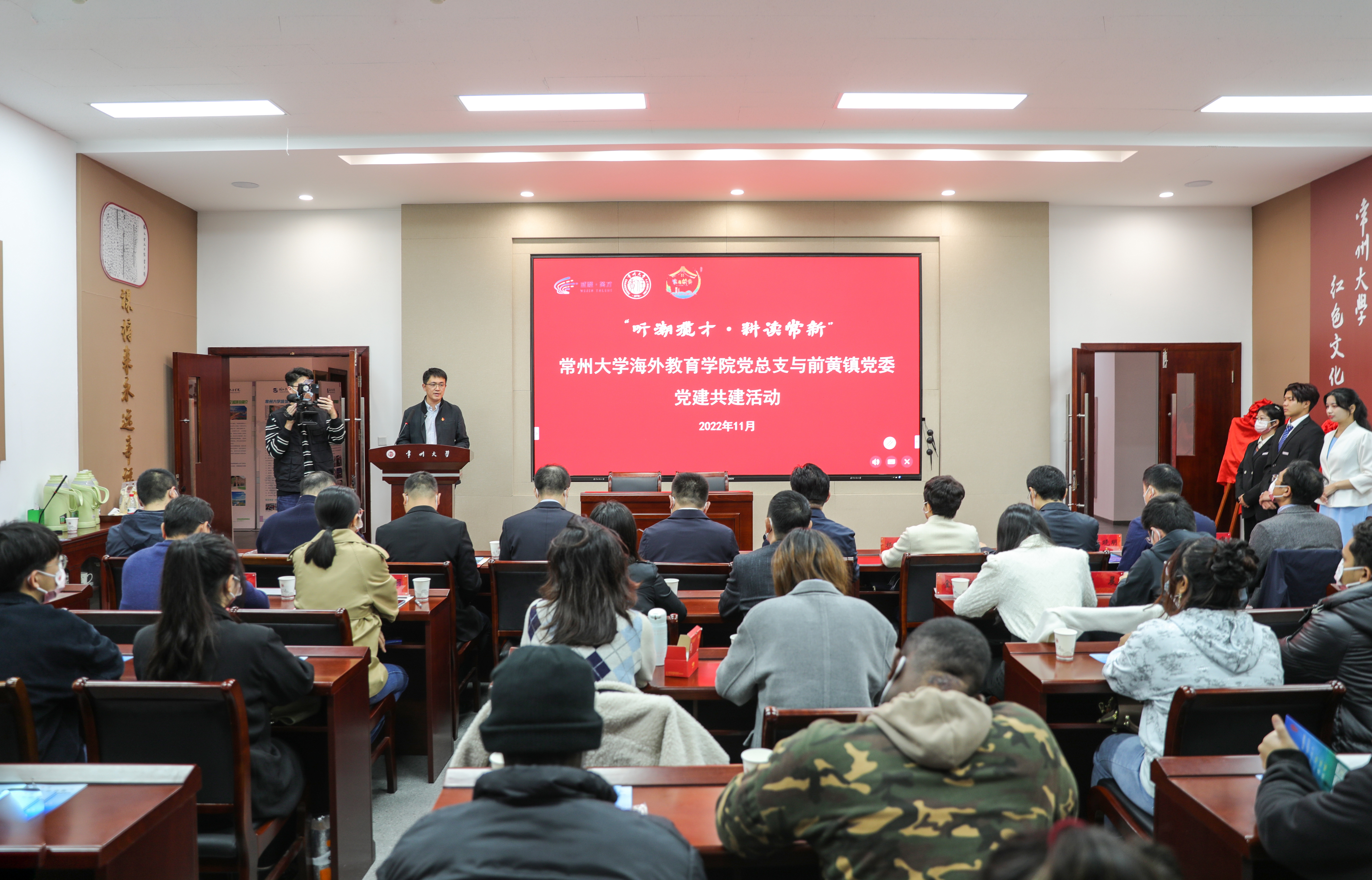 为深入学习贯彻党的二十大精神,持续加强党的基层组织建设,助力全面推进乡村振兴,11月22日下午,海外教育学院党总支与前黄镇党委在科教城校区文彰楼太雷讲堂共同开展“听潮揽才·耕读常新”党建共建活动。武进区委组织部副部长任捷,区委统战部副部长、侨办主任、侨联主席杨美英,前黄镇党委书记龚新宇,前黄镇党委副书记唐晓明,前黄镇副镇长张永相,常州大学党委副书记、副校长戴国洪,党委组织部、统战部、党委教师工作部、高层次人才办公室、海外教育学院相关负责人参加活动。