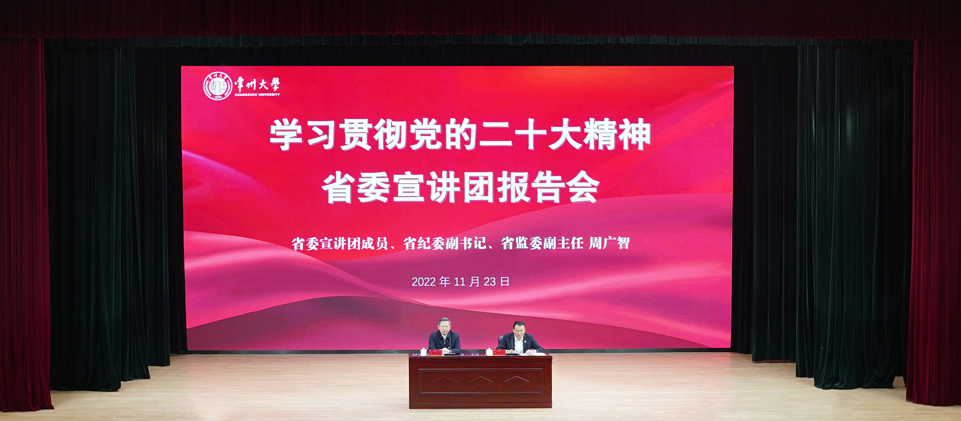 11月23日,学习贯彻党的二十大精神省委宣讲团报告会在我校西太湖校区立艺楼大礼堂举行。党的二十大代表、省委宣讲团成员、省纪委副书记、省监委副主任周广智作宣讲报告。全体校领导、党委理论学习中心组成员、全体中层干部,民主党派、统战团体代表,马克思主义学院教师,辅导员,学生代表现场聆听报告。党委书记陈群主持报告会。